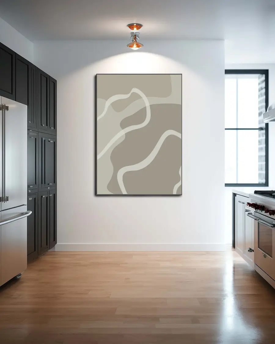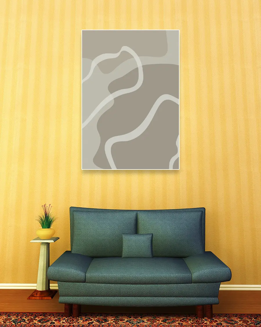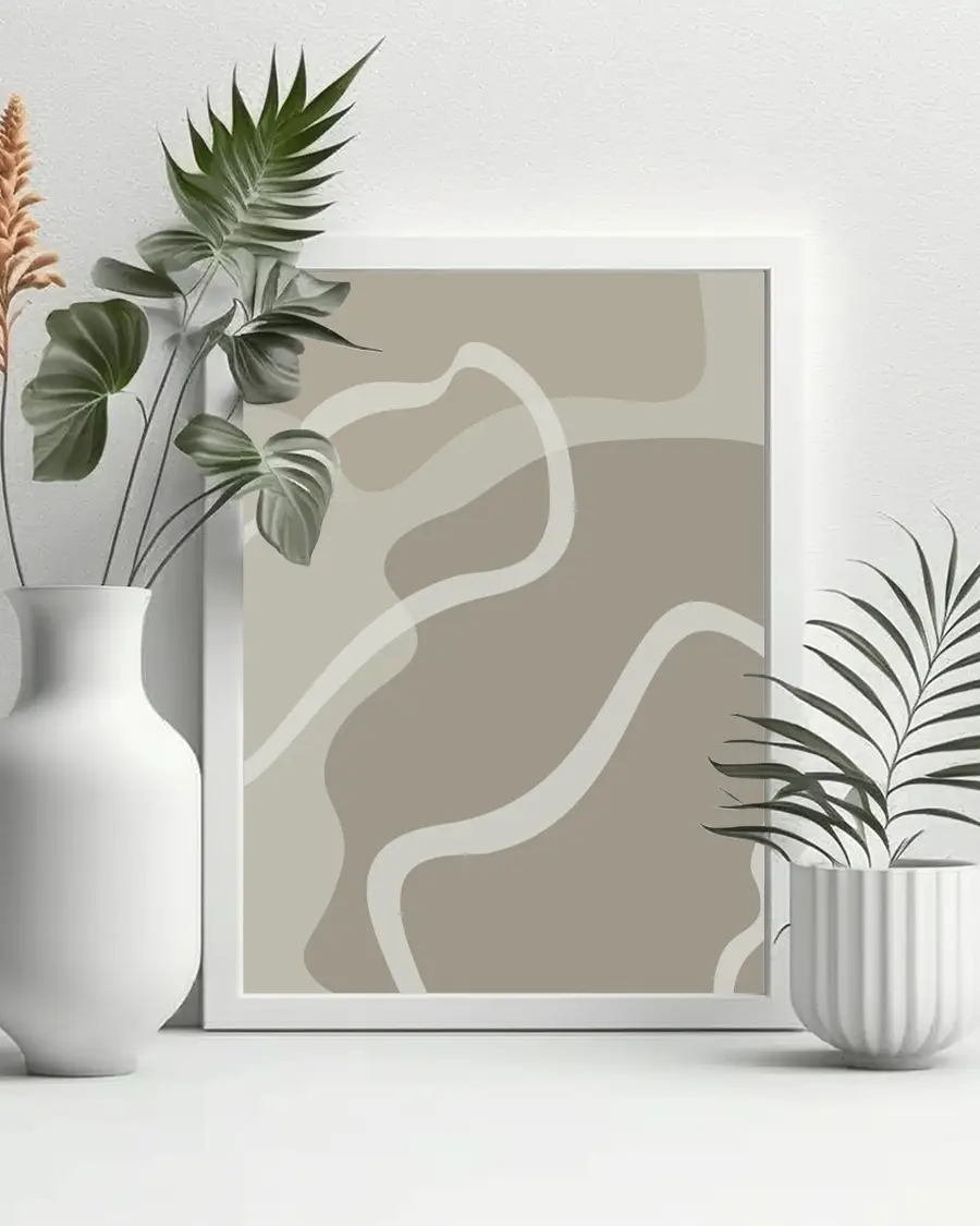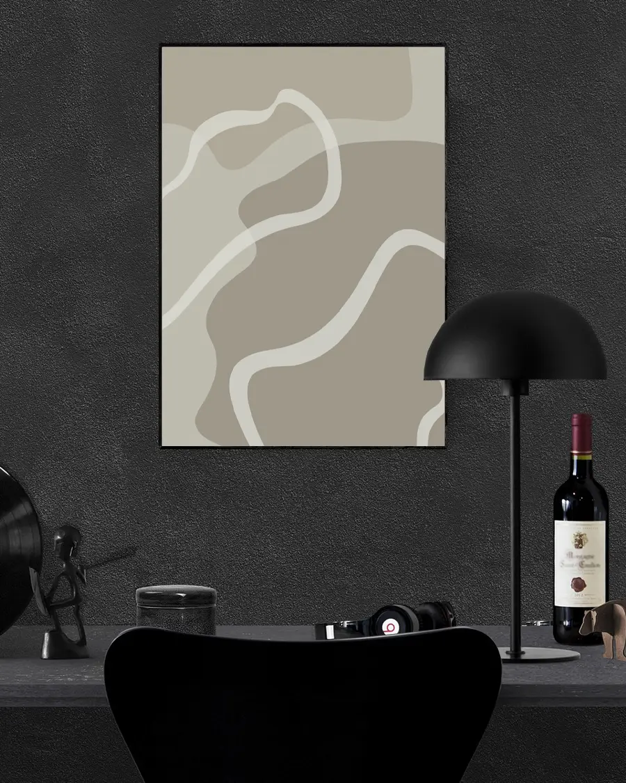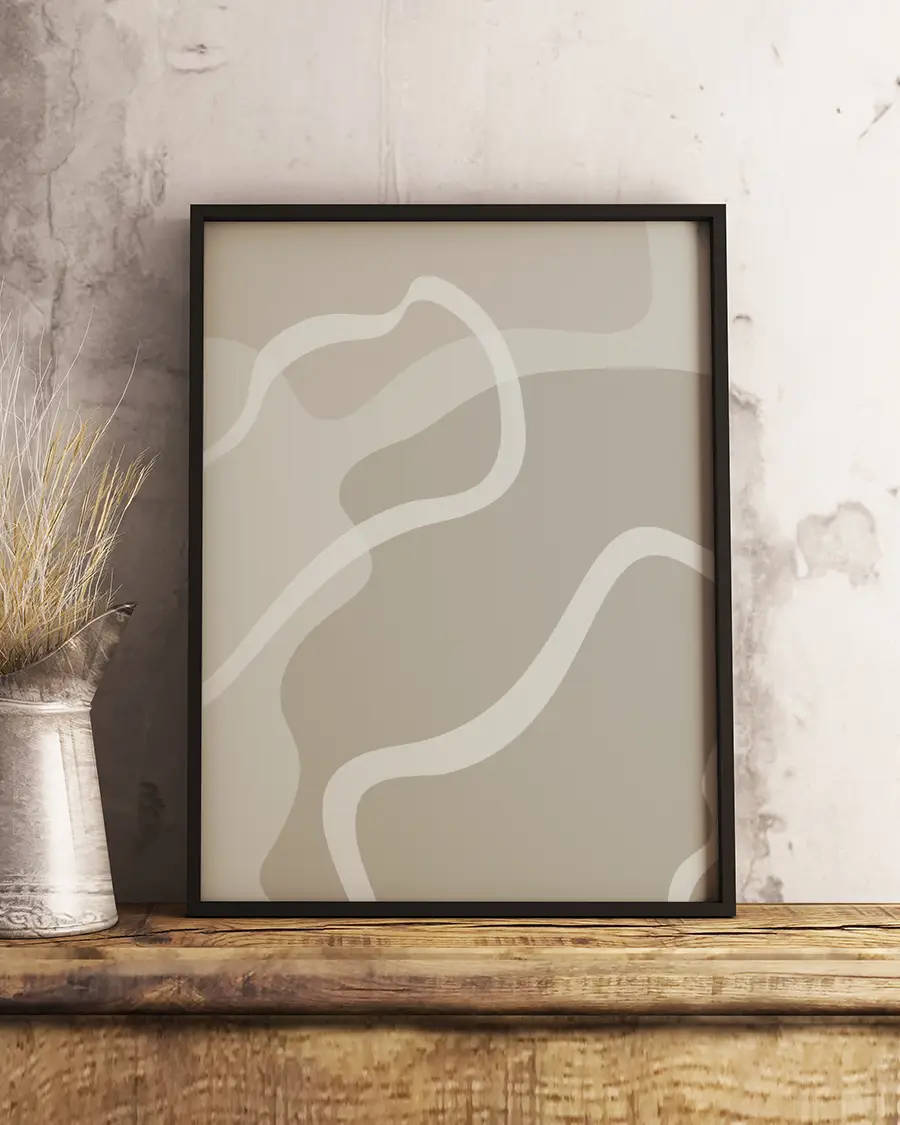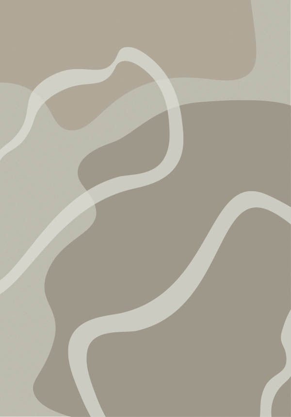 De böljande linjerna i dämpade, jordnära nyanser skapar ett harmoniskt samspel som förmedlar lugn, balans och rörelse. Illustrationens abstrakta uttryck gör att den kan tolkas på nytt varje gång du ser den – subtil men samtidigt uttrycksfull.