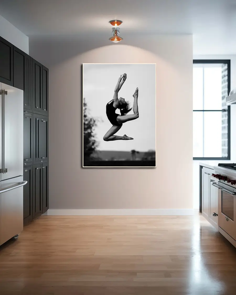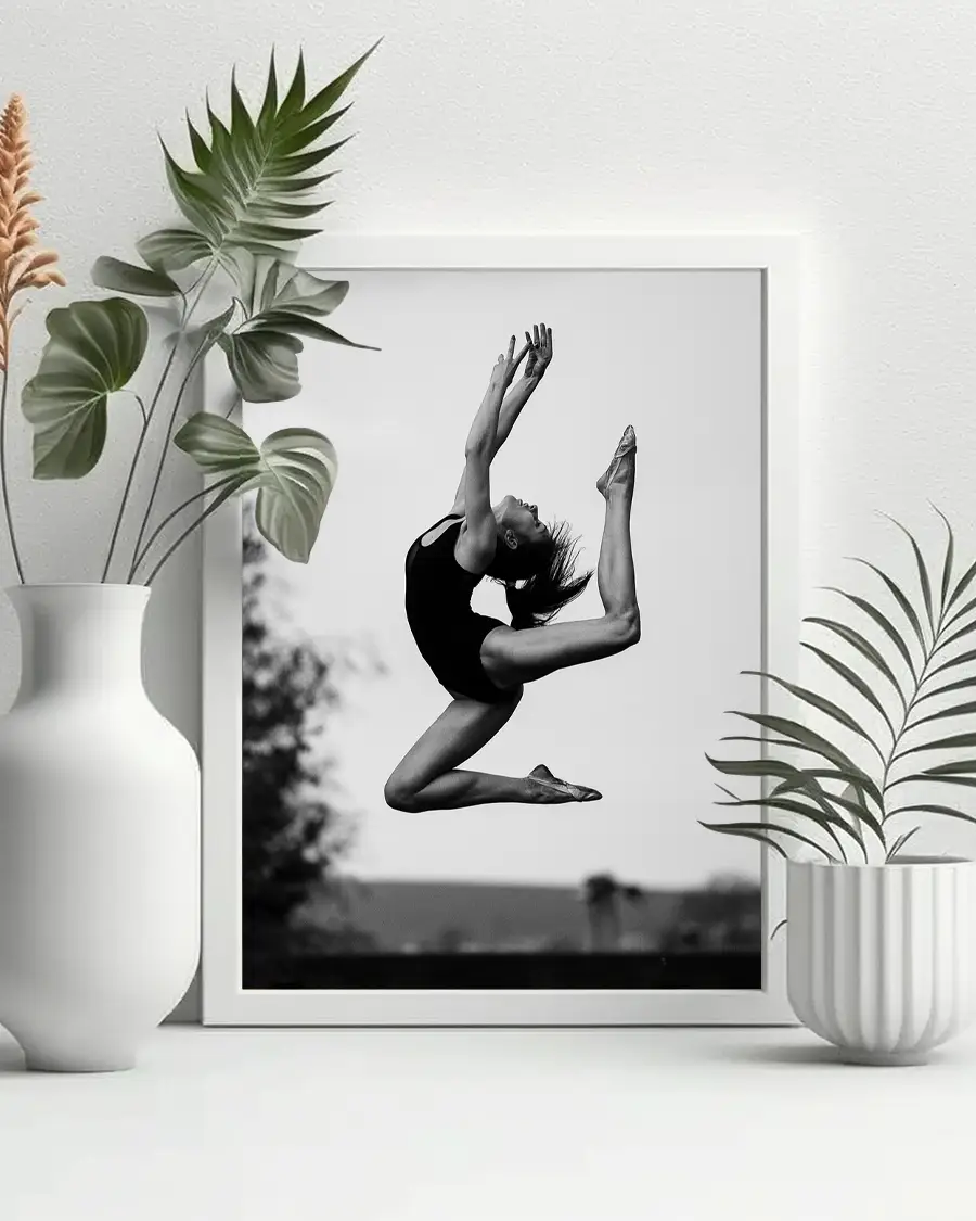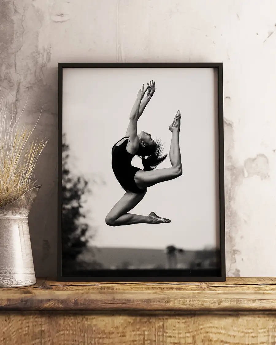 Den suddiga bakgrunden gör språnget ännu mer dramatiskt och förstärker känslan av flykt och frihet. Genom de monokroma tonerna framträder både styrka och grace, och bilden blir ett tidlöst konstverk som hyllar rörelsens elegans.