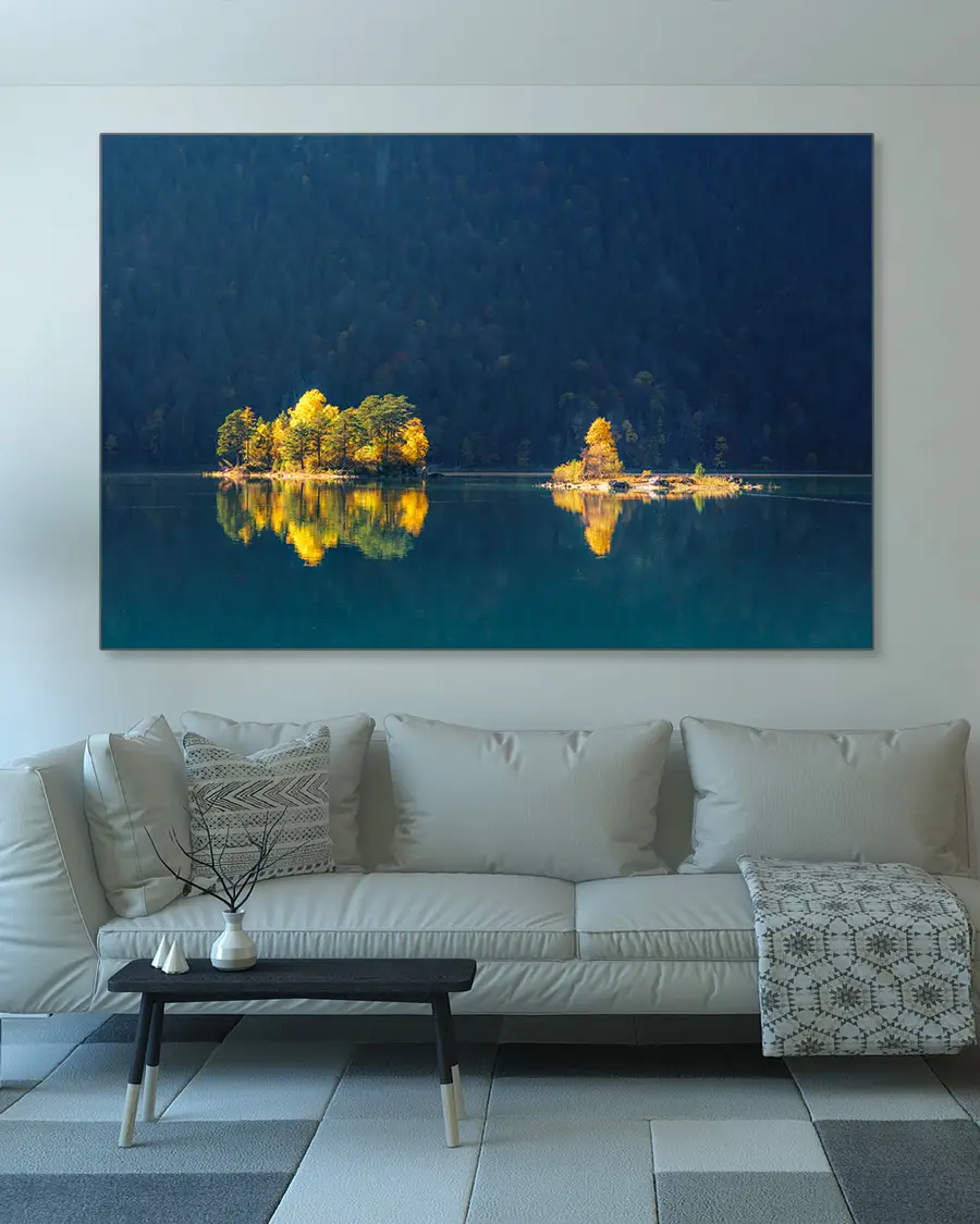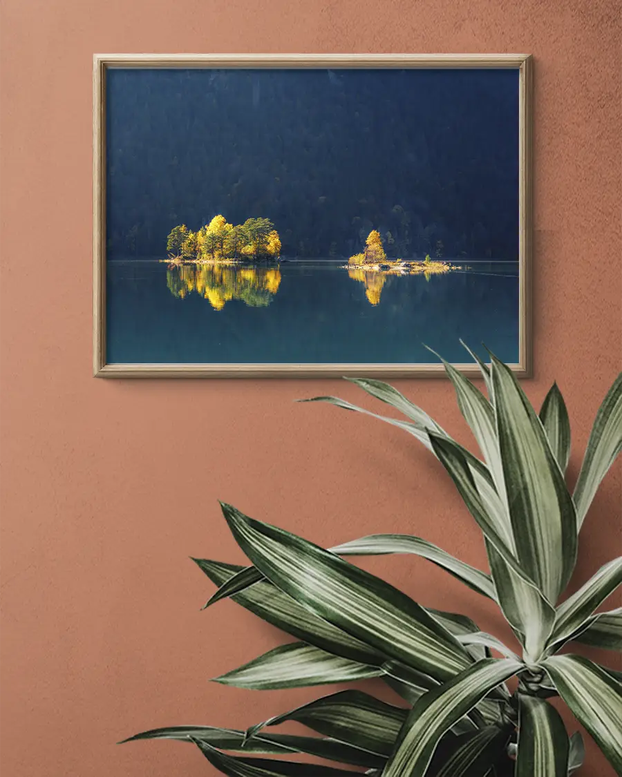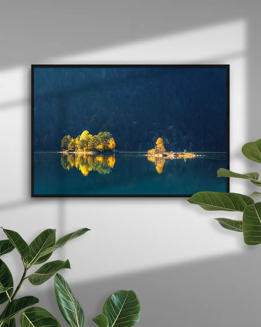 Ett stämningsfullt fotografi från sjön Eibsee nära Garmisch-Partenkirchen i Bayern, Tyskland. Solbelysta höstträd på små öar speglas i det kristallklara vattnet och skapar ett lugnt och harmoniskt landskap.