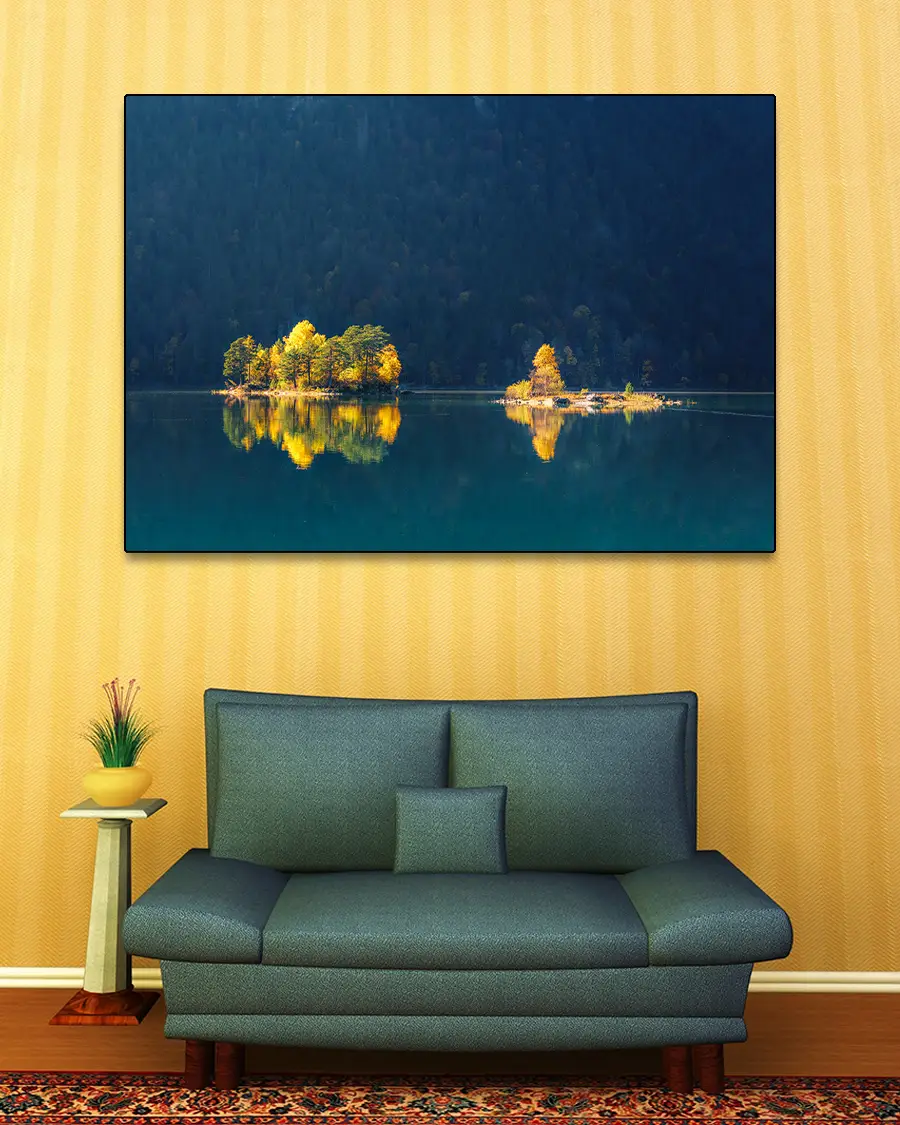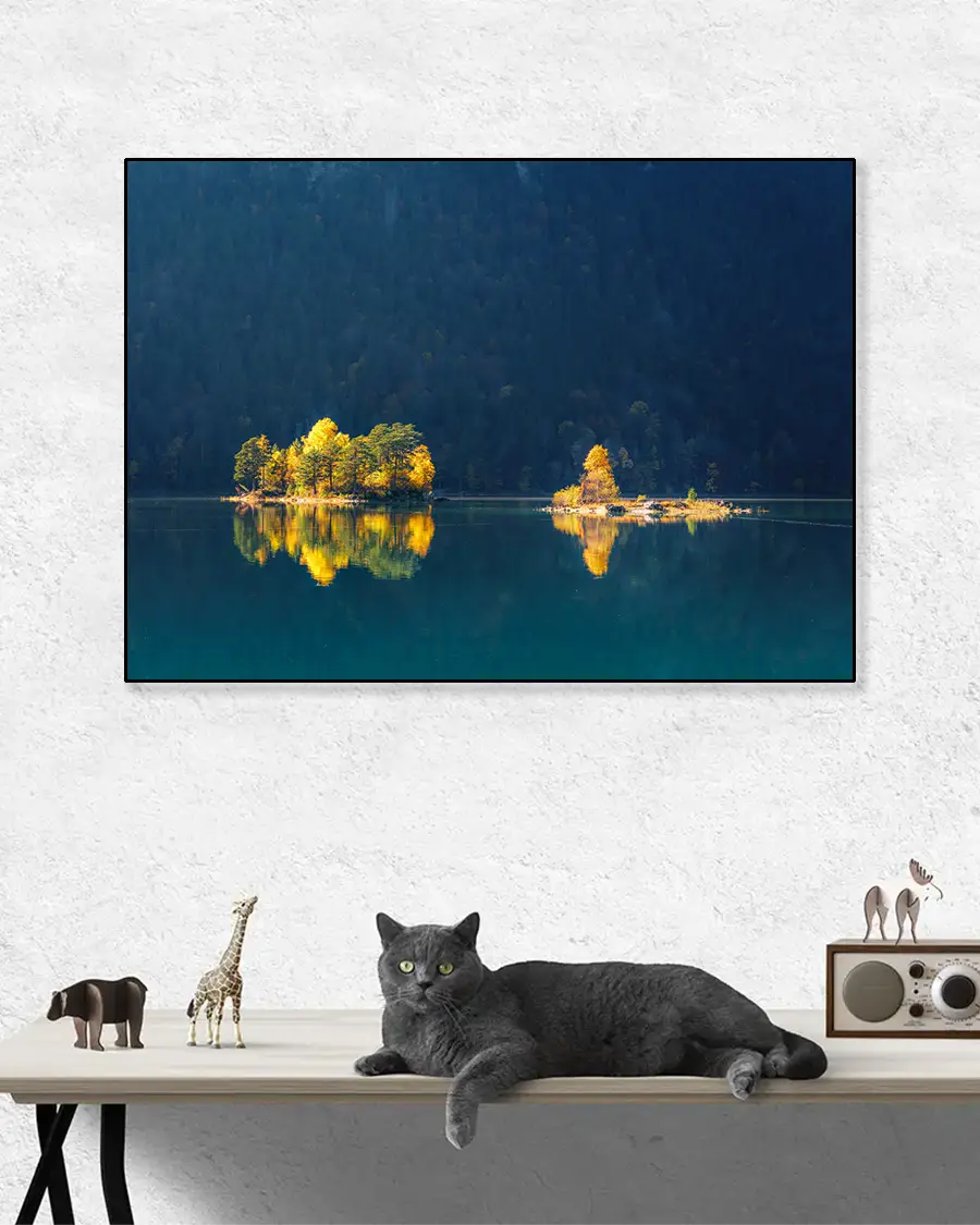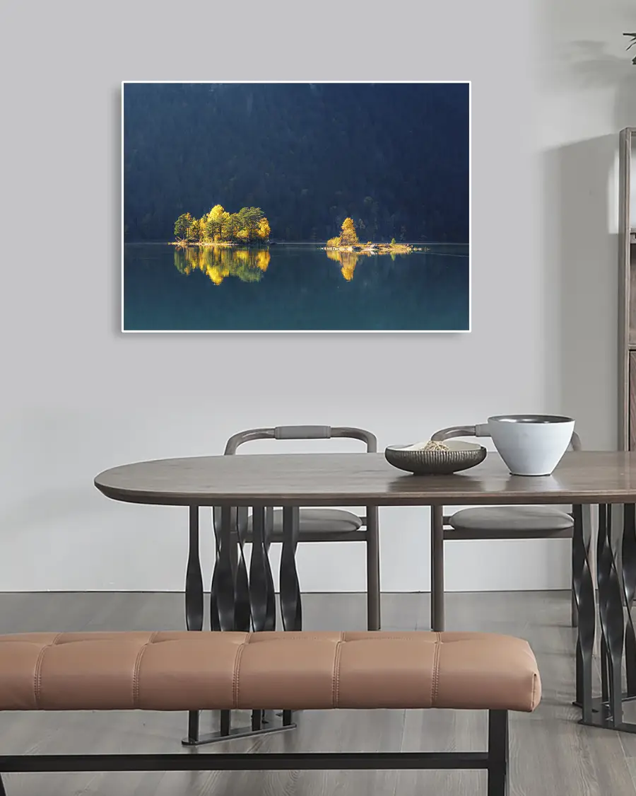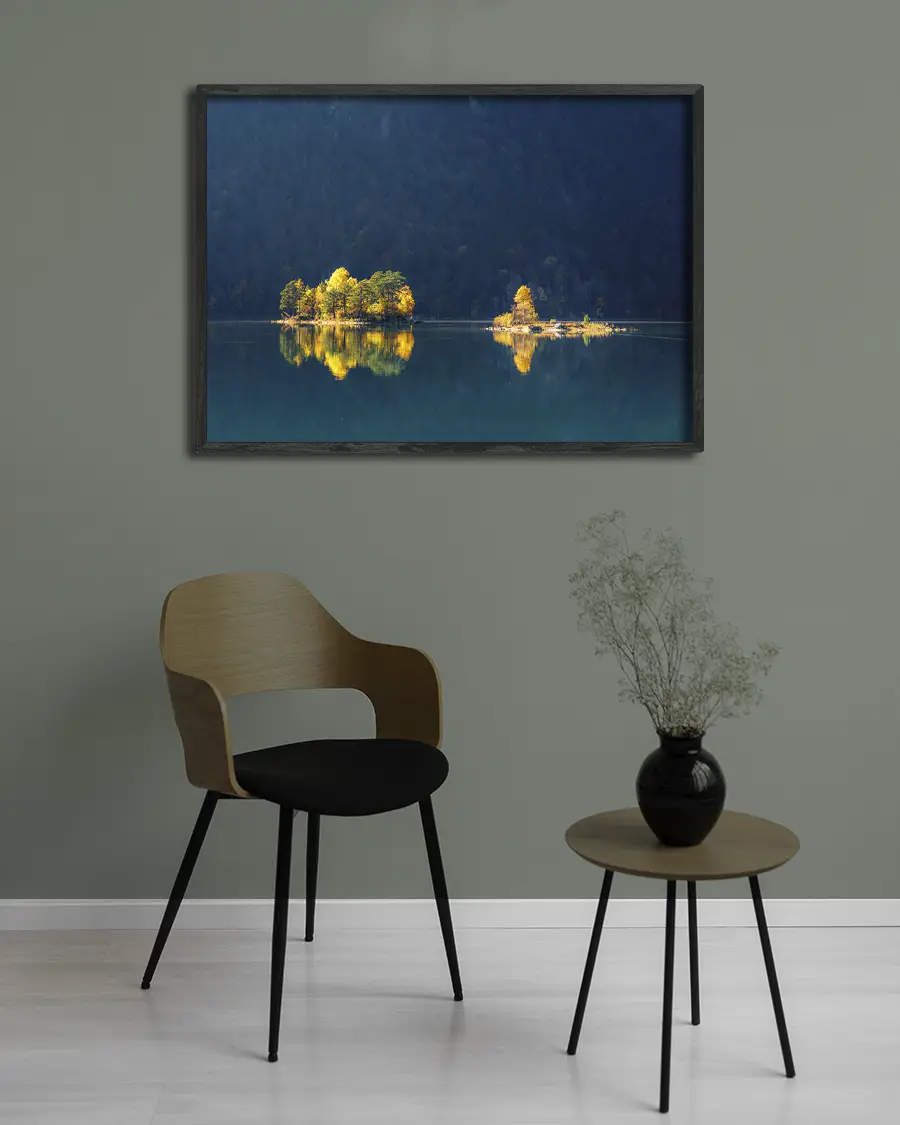 Ett stämningsfullt fotografi från sjön Eibsee nära Garmisch-Partenkirchen i Bayern, Tyskland. Solbelysta höstträd på små öar speglas i det kristallklara vattnet och skapar ett lugnt och harmoniskt landskap.
