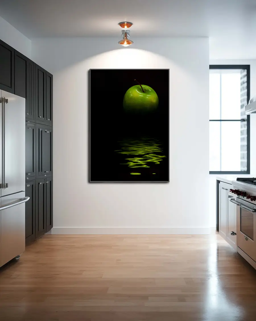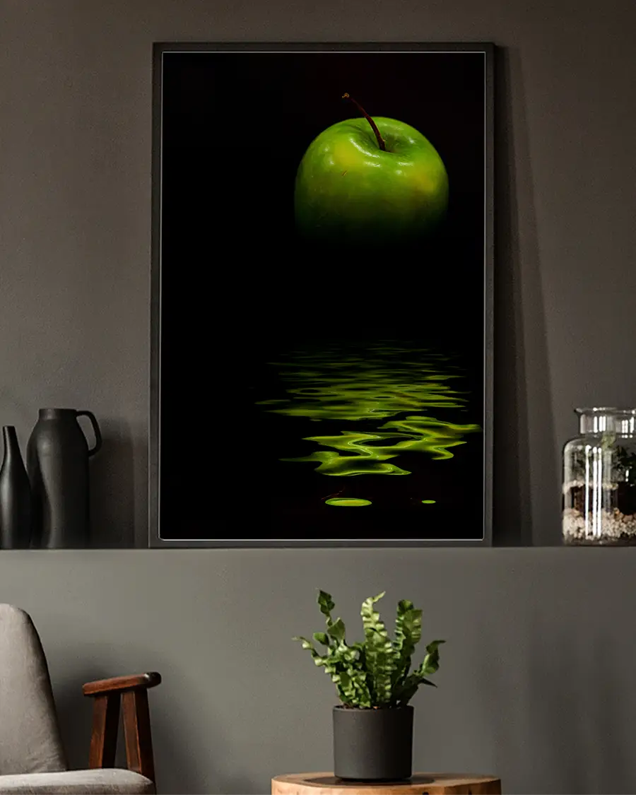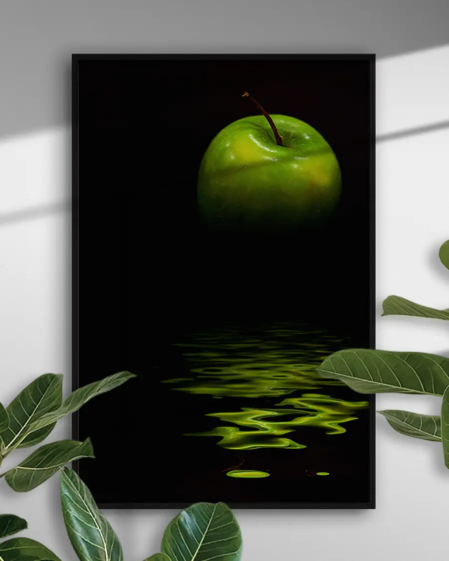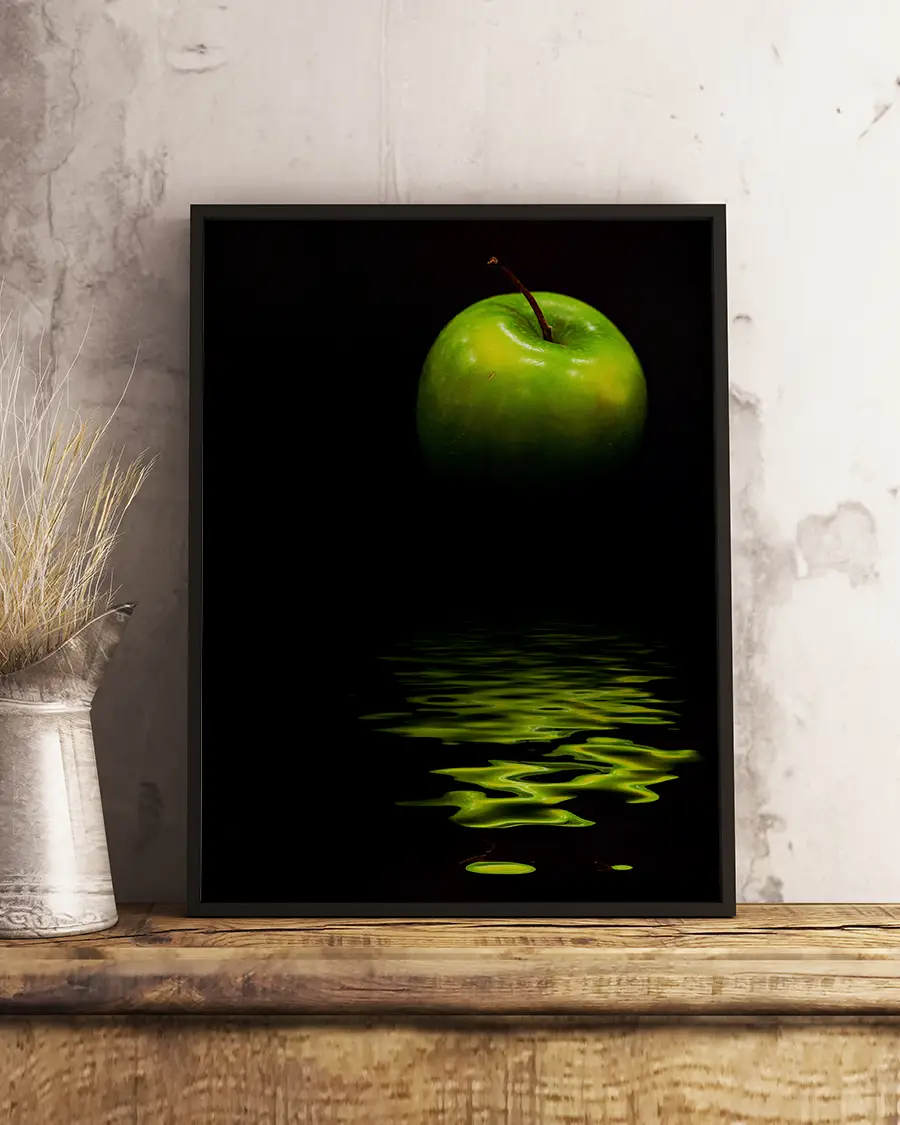 Kontrasten mellan den mörka bakgrunden och äpplets intensiva gröna nyans ger motivet ett kraftfullt och exklusivt uttryck. Vattenspegeln tillför djup och en nästan surrealistisk känsla, där verklighet och reflektion möts i ett poetiskt ögonblick. Motivet väcker associationer till balans, fräschör och naturens rena enkelhet – ett konstverk som bjuder in till eftertanke.