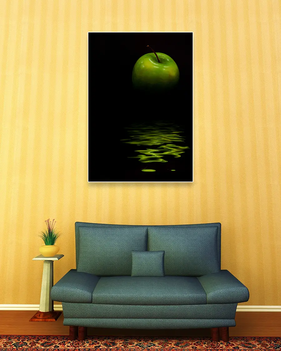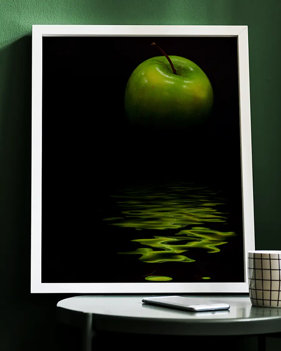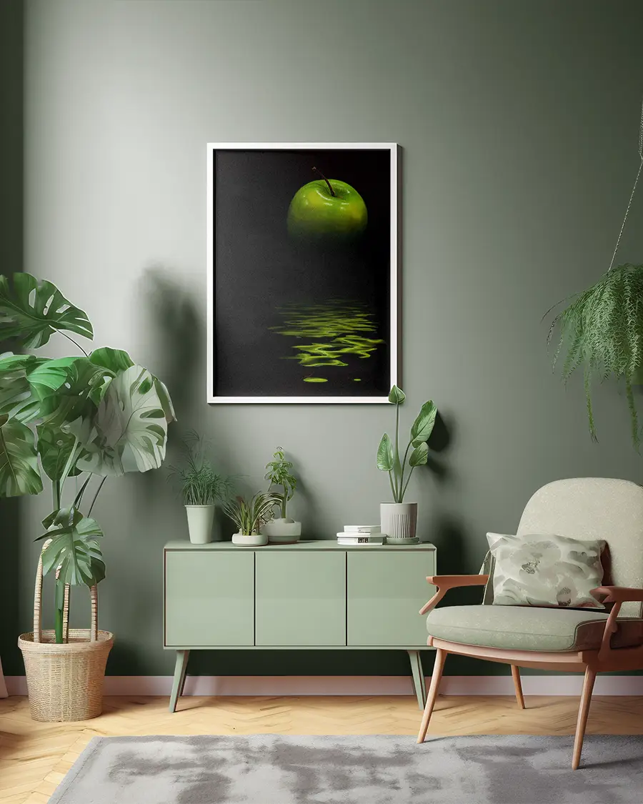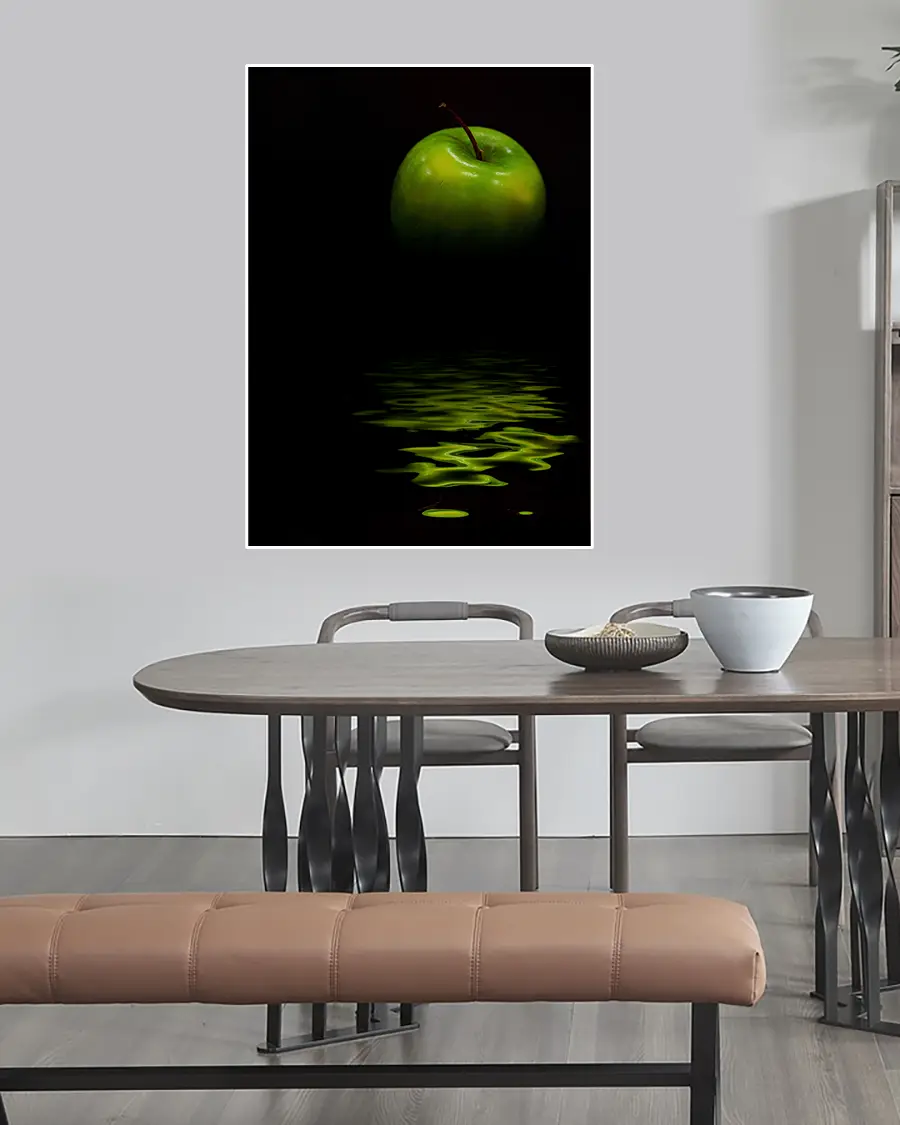 Kontrasten mellan den mörka bakgrunden och äpplets intensiva gröna nyans ger motivet ett kraftfullt och exklusivt uttryck. Vattenspegeln tillför djup och en nästan surrealistisk känsla, där verklighet och reflektion möts i ett poetiskt ögonblick. Motivet väcker associationer till balans, fräschör och naturens rena enkelhet – ett konstverk som bjuder in till eftertanke.