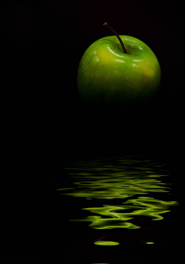 Ett friskt grönt äpple svävar fritt mot en djup, svart bakgrund, där ljuset varsamt framhäver dess släta yta och naturliga form. Under äpplet breder en skimrande vattenyta ut sig, där reflektionen bryts upp i mjuka rörelser och skapar ett levande samspel mellan stillhet och dynamik.