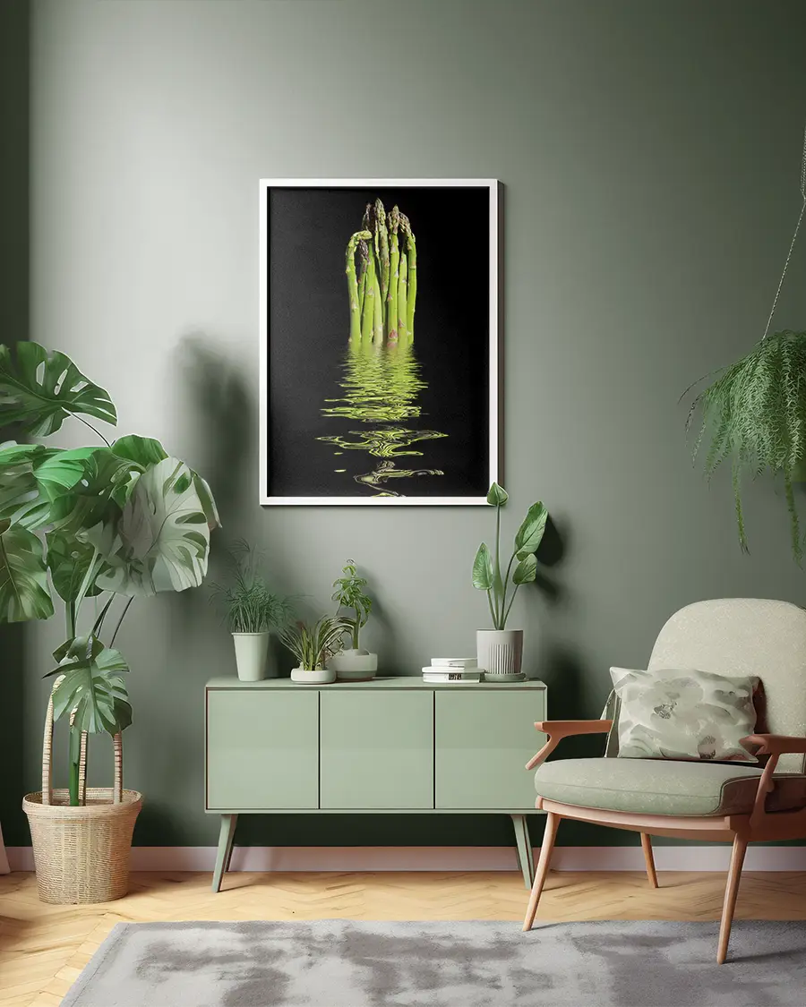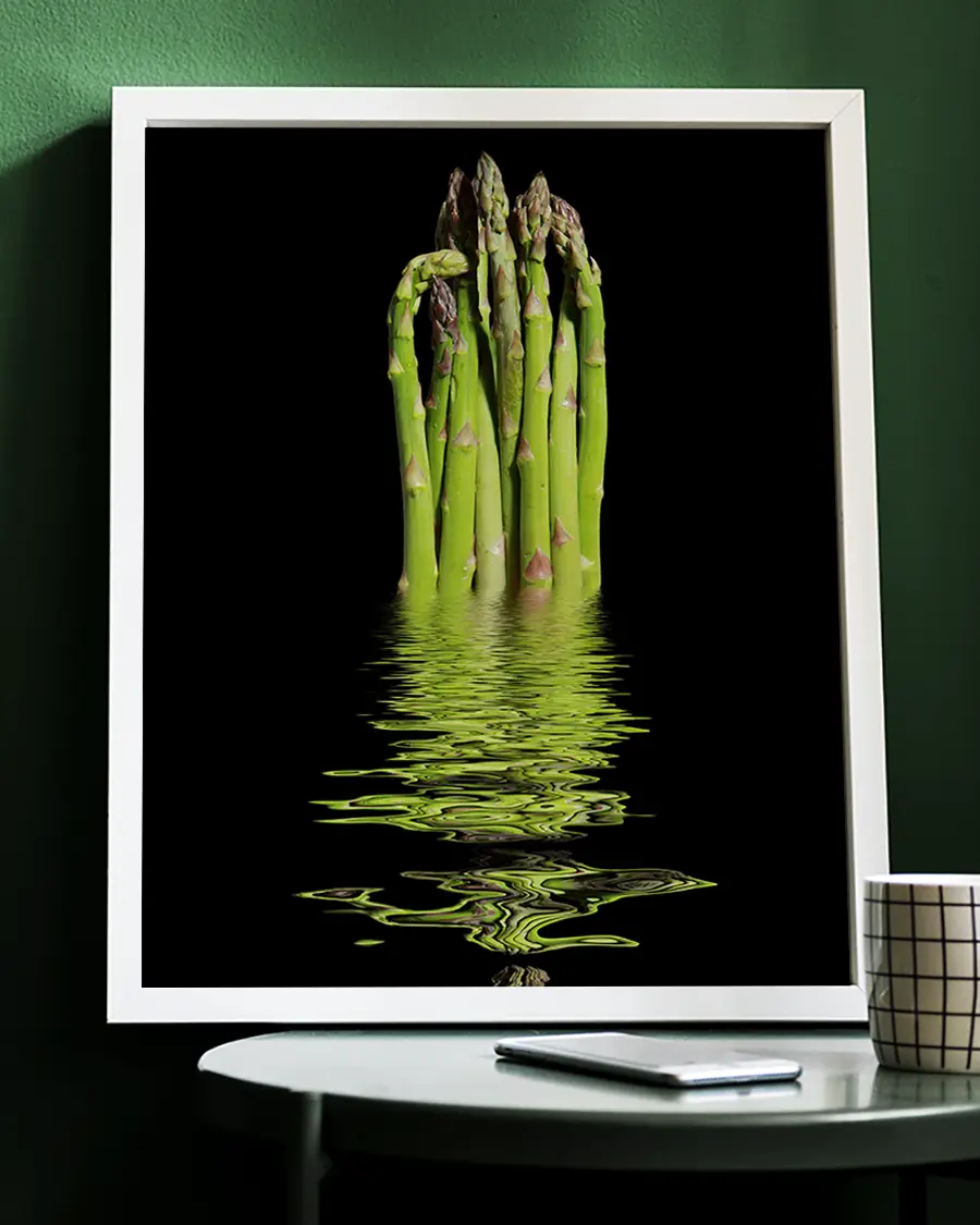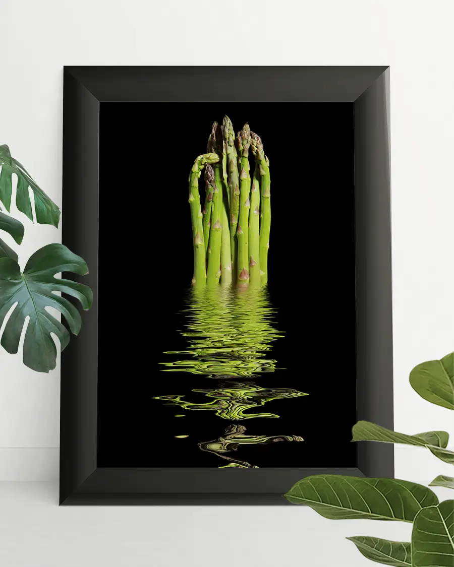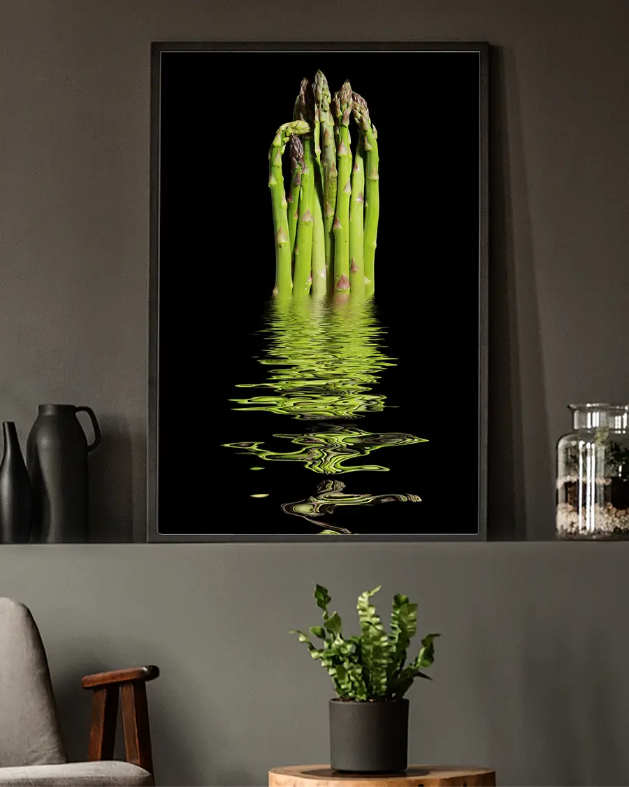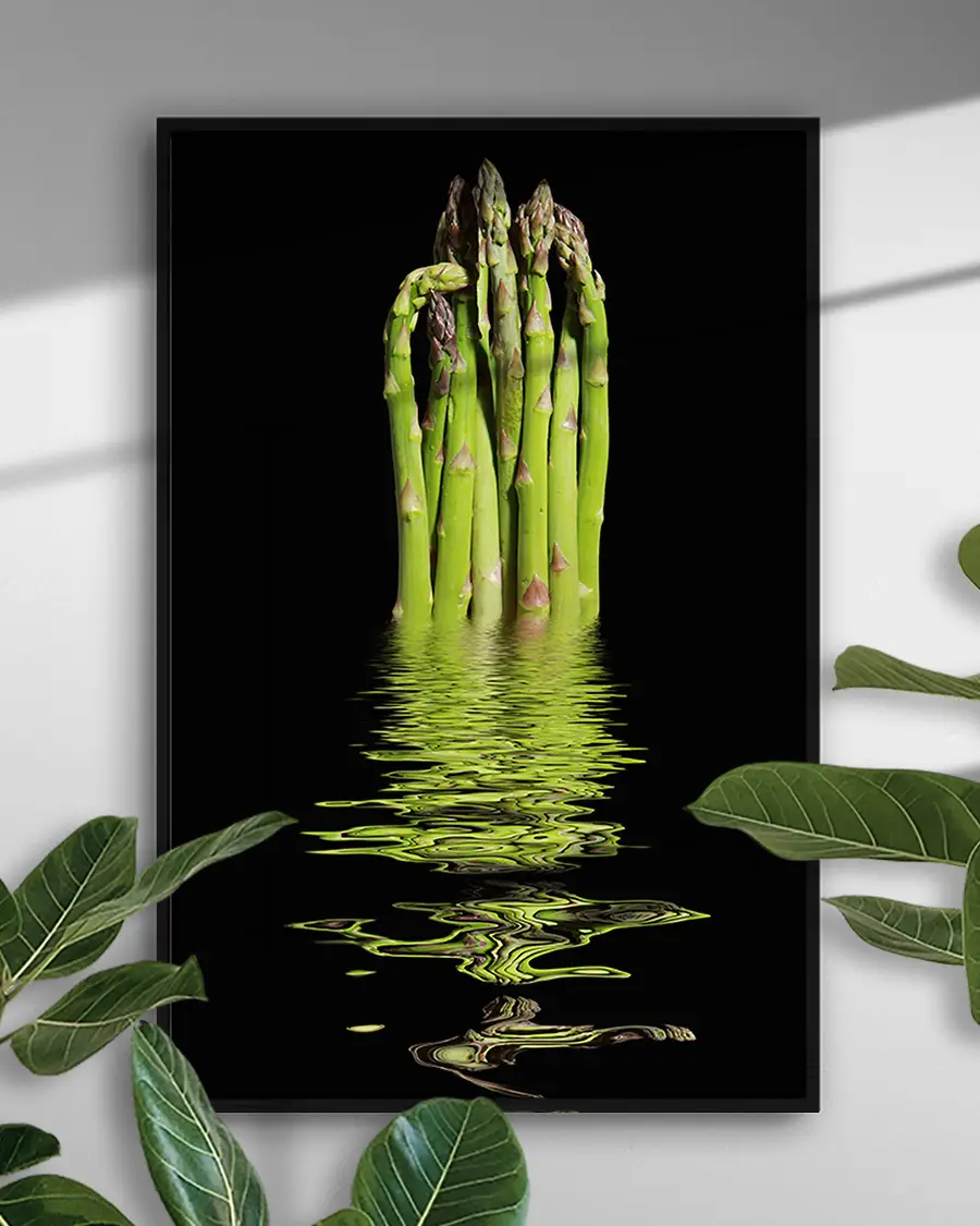 Kontrasten mellan den mörka bakgrunden och sparrisknippets intensiva gröna nyans ger motivet ett kraftfullt och exklusivt uttryck. Vattenspegeln tillför djup och en nästan surrealistisk känsla, där verklighet och reflektion möts i ett poetiskt ögonblick. Motivet väcker associationer till balans, fräschör och naturens rena enkelhet – ett konstverk som bjuder in till eftertanke.