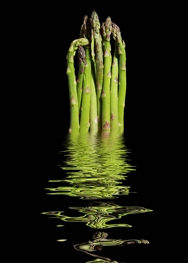 Ett knippe färska sparrisstänger svävar fritt mot en djup, svart bakgrund, där ljuset varsamt framhäver dess släta yta och naturliga form. Under sparrisarna breder en skimrande vattenyta ut sig, där reflektionen bryts upp i mjuka rörelser och skapar ett levande samspel mellan stillhet och dynamik.
