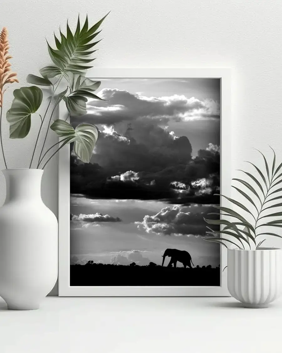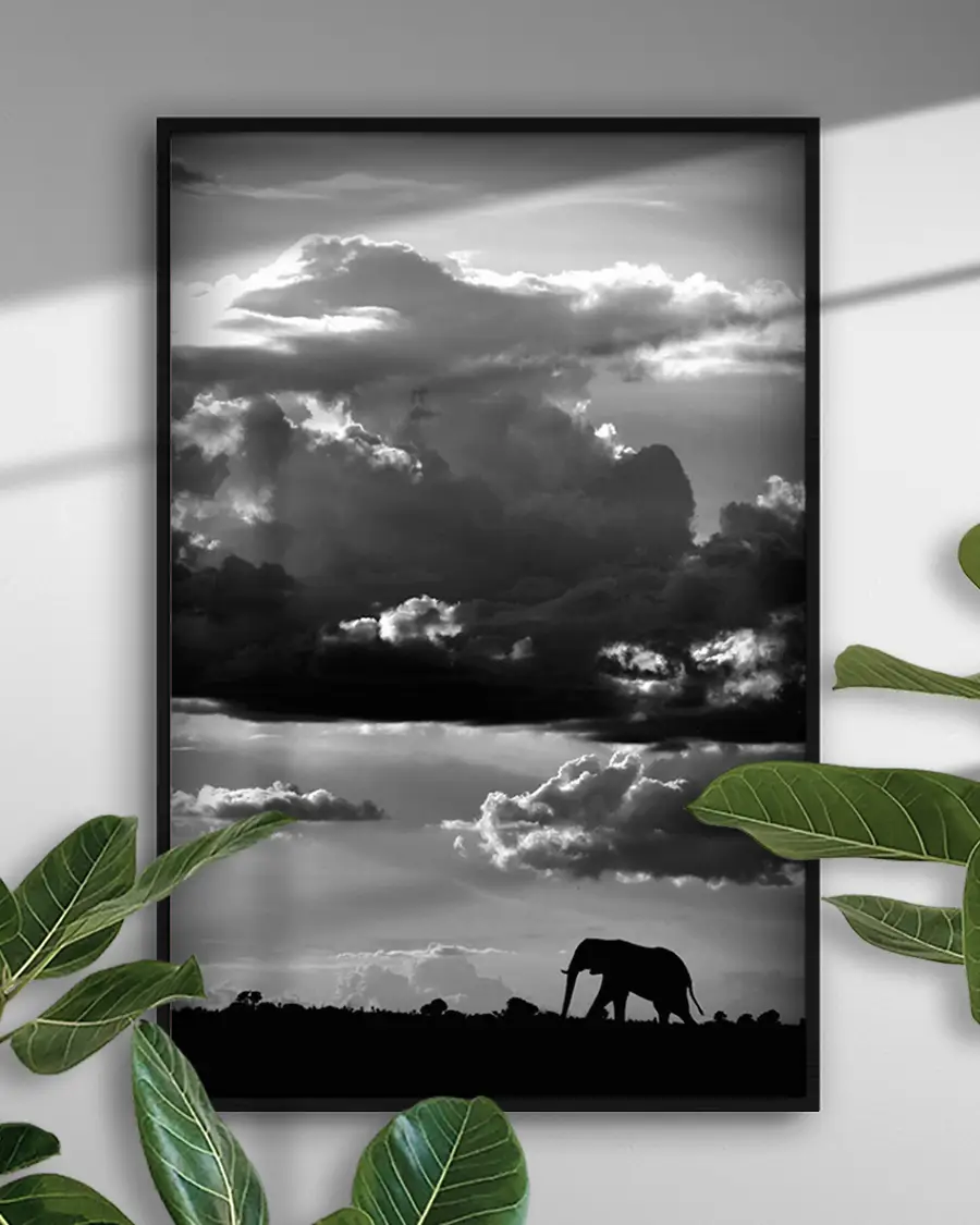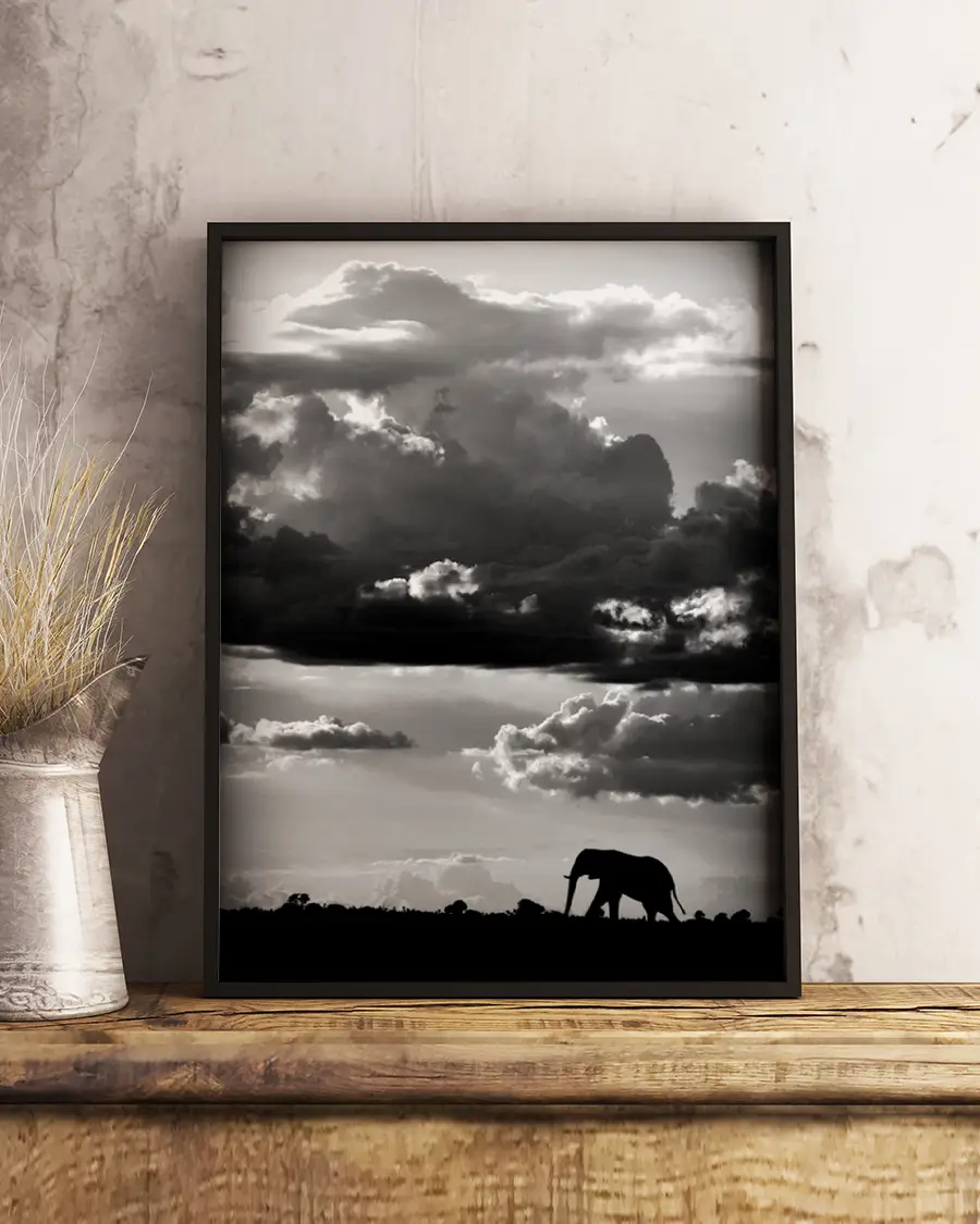 Ett mäktigt svartvitt fotografi av en ensam elefant som vandrar under en dramatisk afrikansk himmel. Molnens ljusa konturer kontrasterar mot landskapet och framhäver djurets lugna styrka.