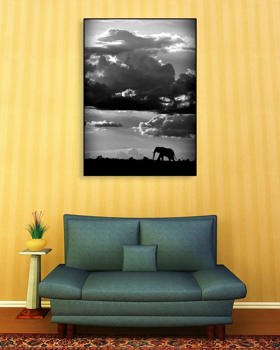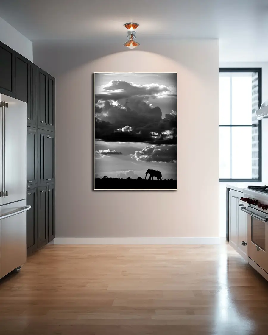 Den dramatiska himlen med sina tunga moln kontrasterar mot savannens mörka konturer och framhäver djurets stilla styrka och närvaro. Ljuset tecknar molnens glödande kanter och skapar en känsla av frihet, skönhet och tidlöshet.