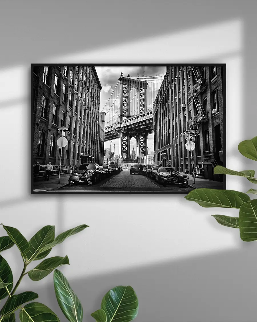Ett ikoniskt svartvitt fotografi av Brooklyn Bridge i New York, fångad mellan stadens tegelklädda byggnader.