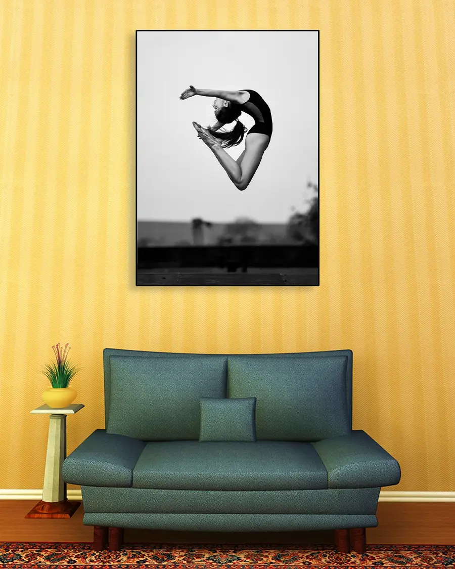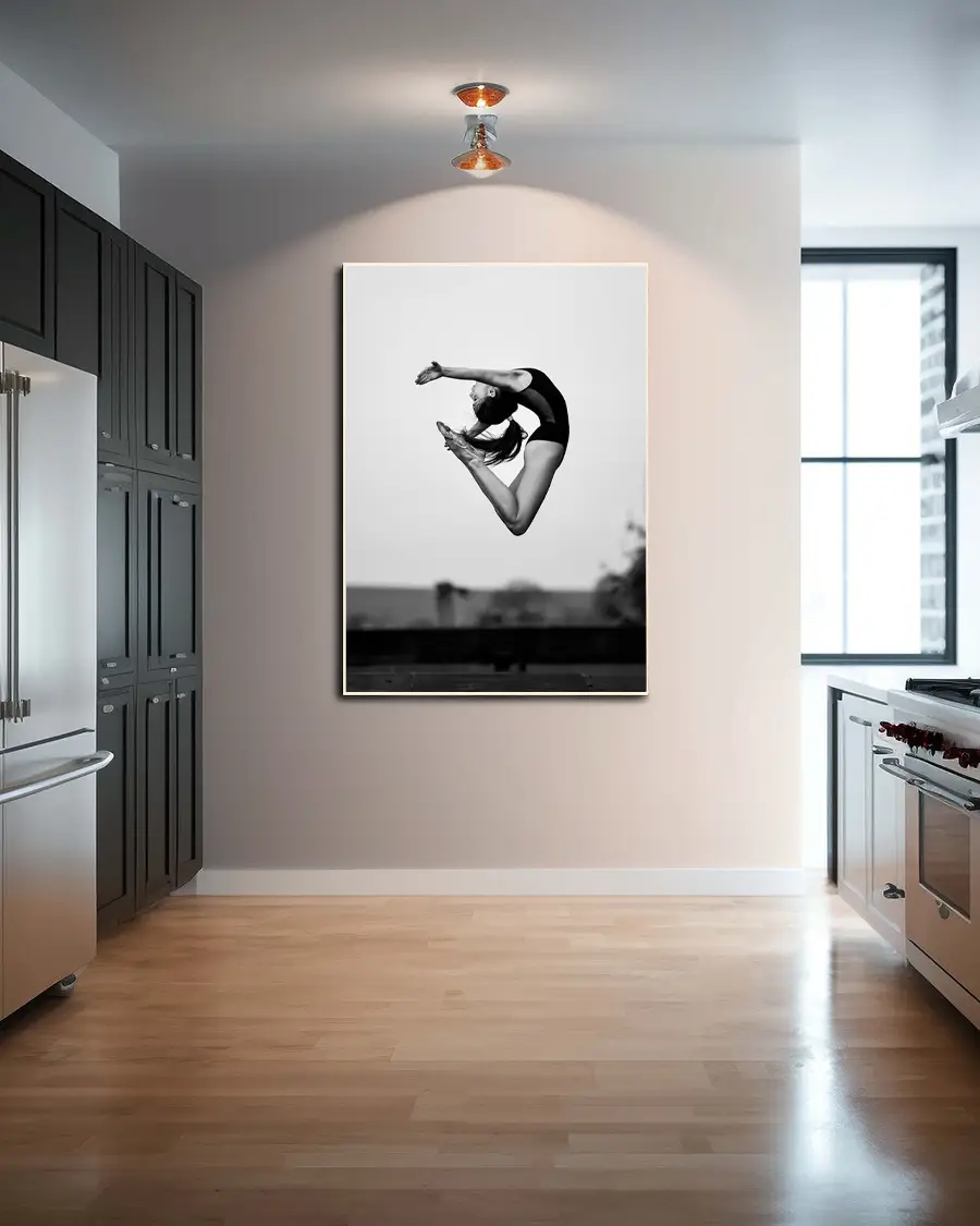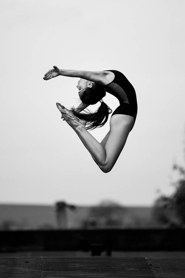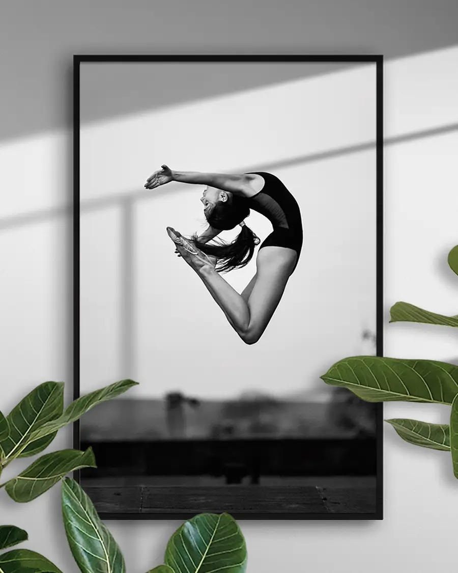 Ett dynamiskt svartvitt fotografi av en ung kvinna i svart trikå som fångats mitt i ett akrobatiskt språng.
