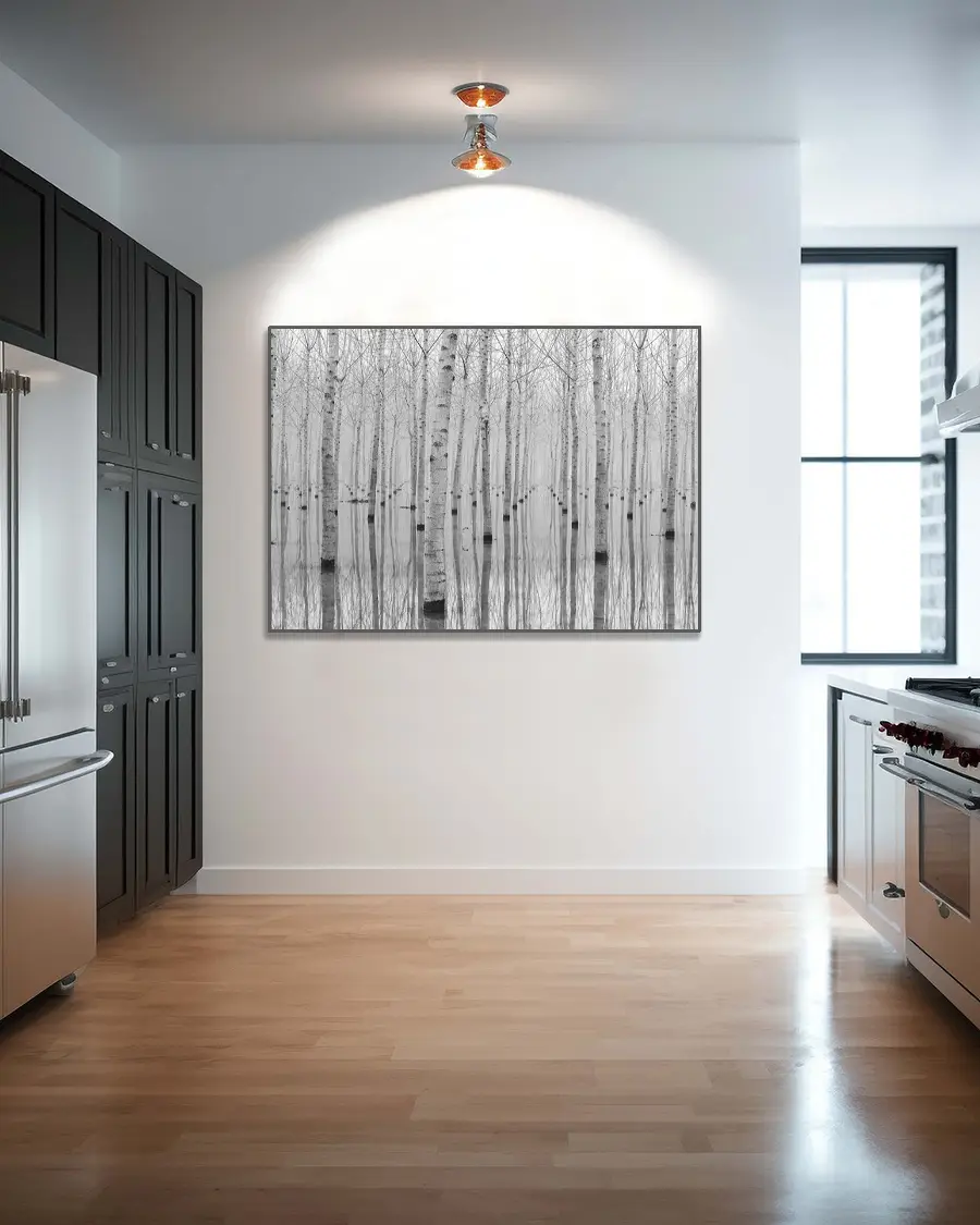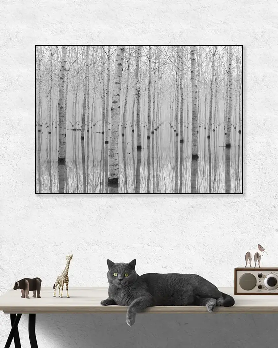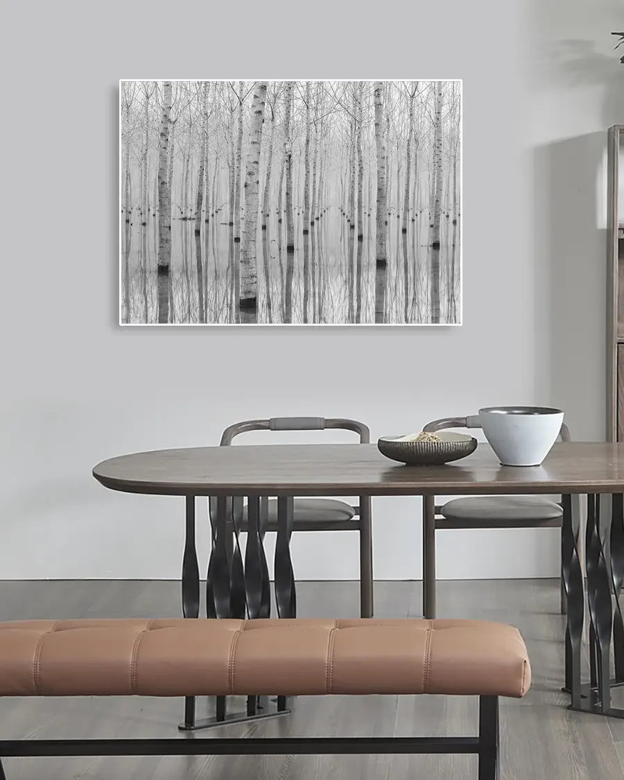 Ett stämningsfullt svartvitt fotografi av kala björkar som speglas i stilla vatten. De ljusa stammarna kontrasterar mot mörka nyanser och bildar ett harmoniskt, nästan drömlikt mönster. Ett lugnt och tidlöst motiv med poetisk närvaro.