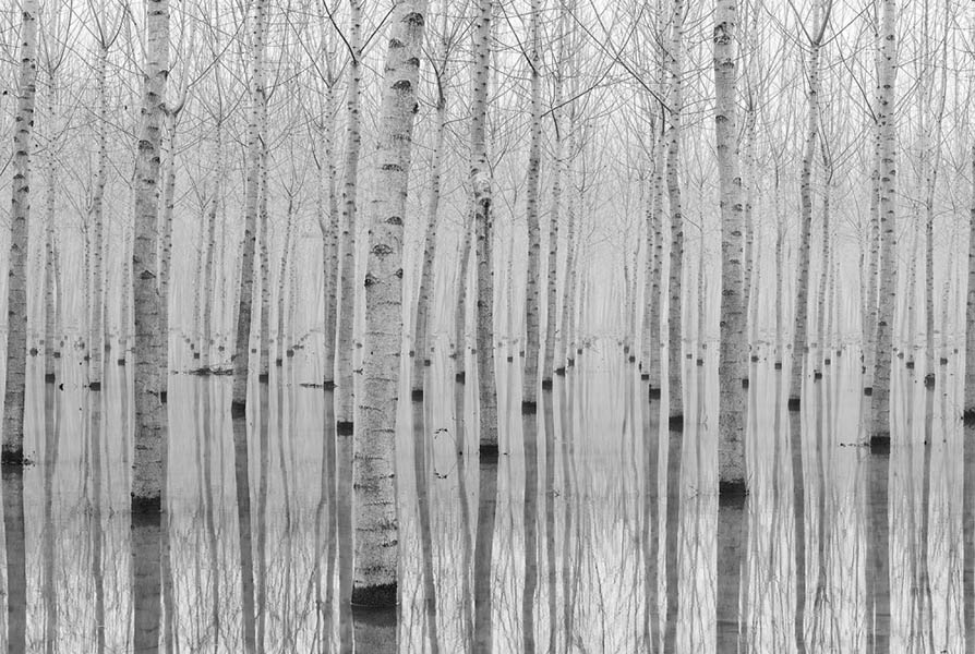 Ett drömskt och stillsamt svartvitt fotografi där en samling kala björkar reser sig ur ett översvämmat landskap.
