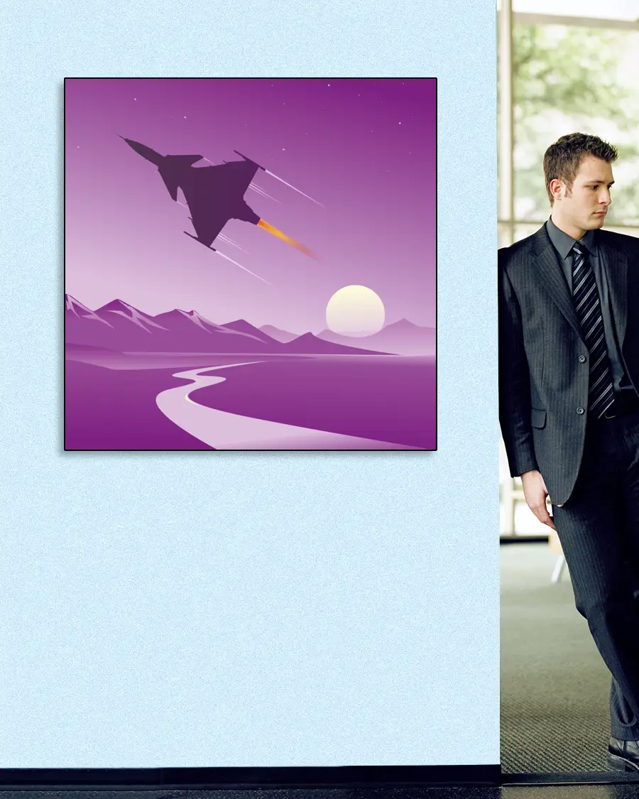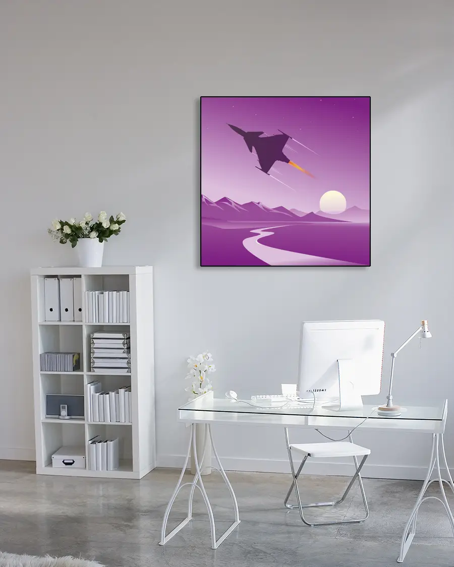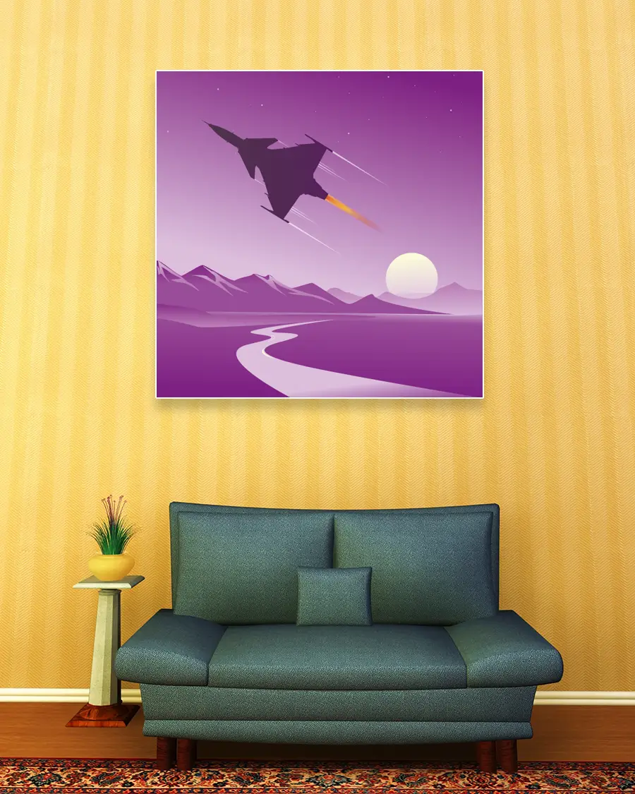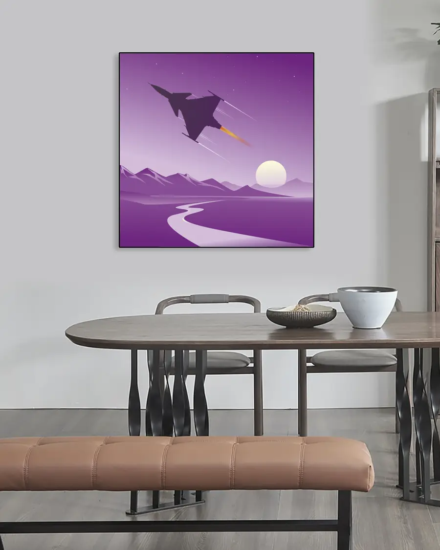 En stiliserad grafisk illustration som visar det svenska stridsflygplanet SAAB JAS 39 Gripen i en lila solnedgång.