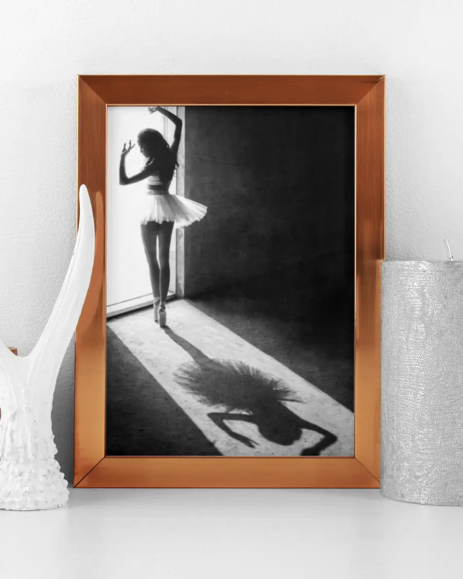Ett elegant svartvitt fotografi av en ballerina fångad i en perfekt pose, där hennes siluett speglas på golvet i ljuset från ett fönster. Den starka kontrasten mellan ljus och skugga framhäver rörelsens grace och balettens tidlösa skönhet.
