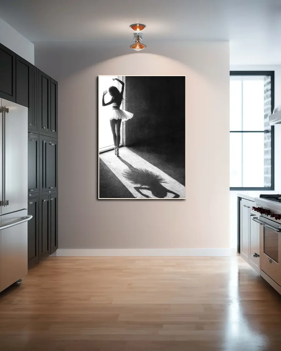 Ljuset från ett fönster faller mjukt över scenen och kastar en tydlig skugga av hennes siluett mot golvet, som om två dansare rör sig i harmoni. Den starka kontrasten mellan ljus och mörker framhäver hennes eleganta form, den skira tutun och rörelsens stilla intensitet.
