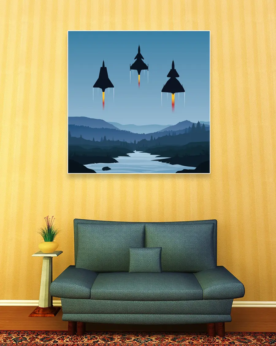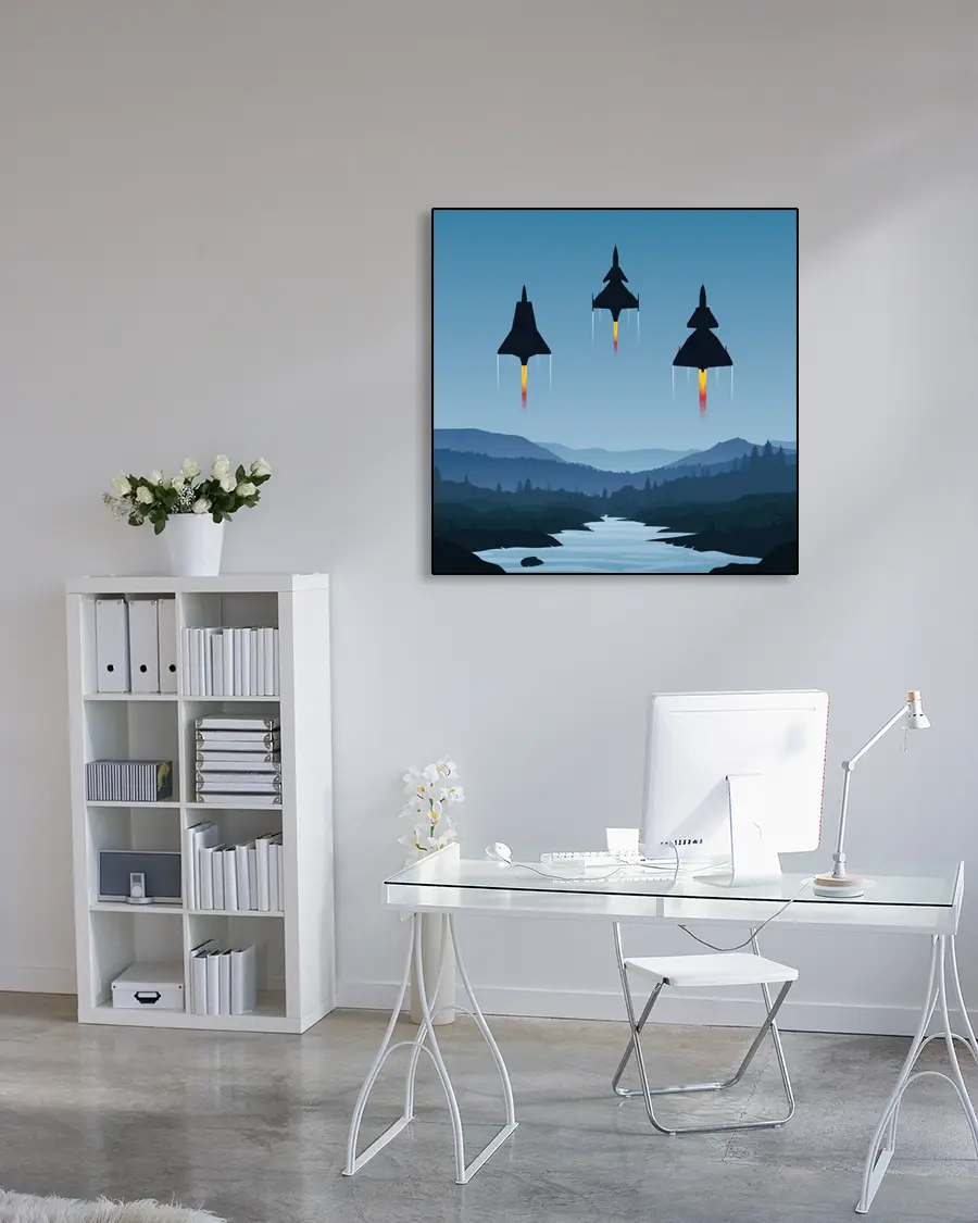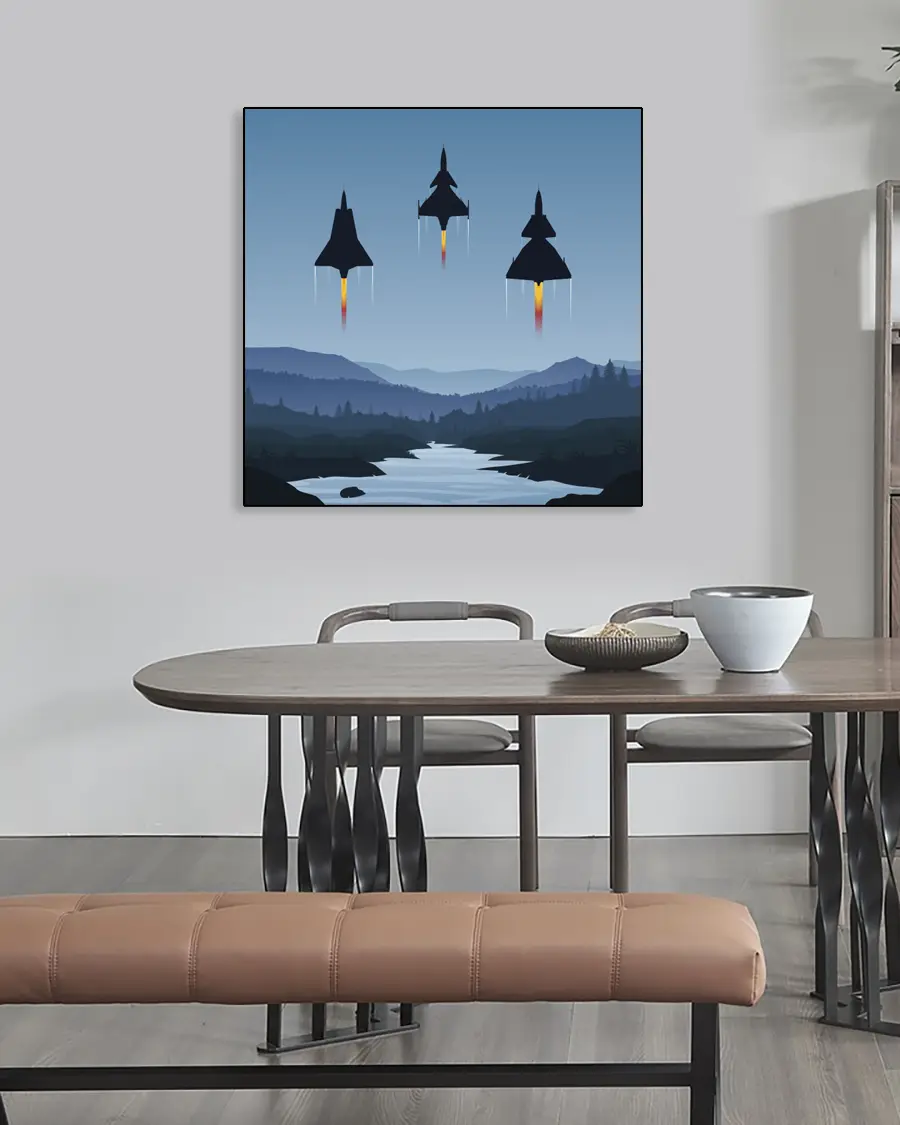 Motivet inkluderar SAAB 35 Draken, SAAB 37 Viggen och SAAB JAS 39 Gripen – tre milstolpar i svensk flyghistoria, fångade i ett kraftfullt och harmoniskt uttryck.