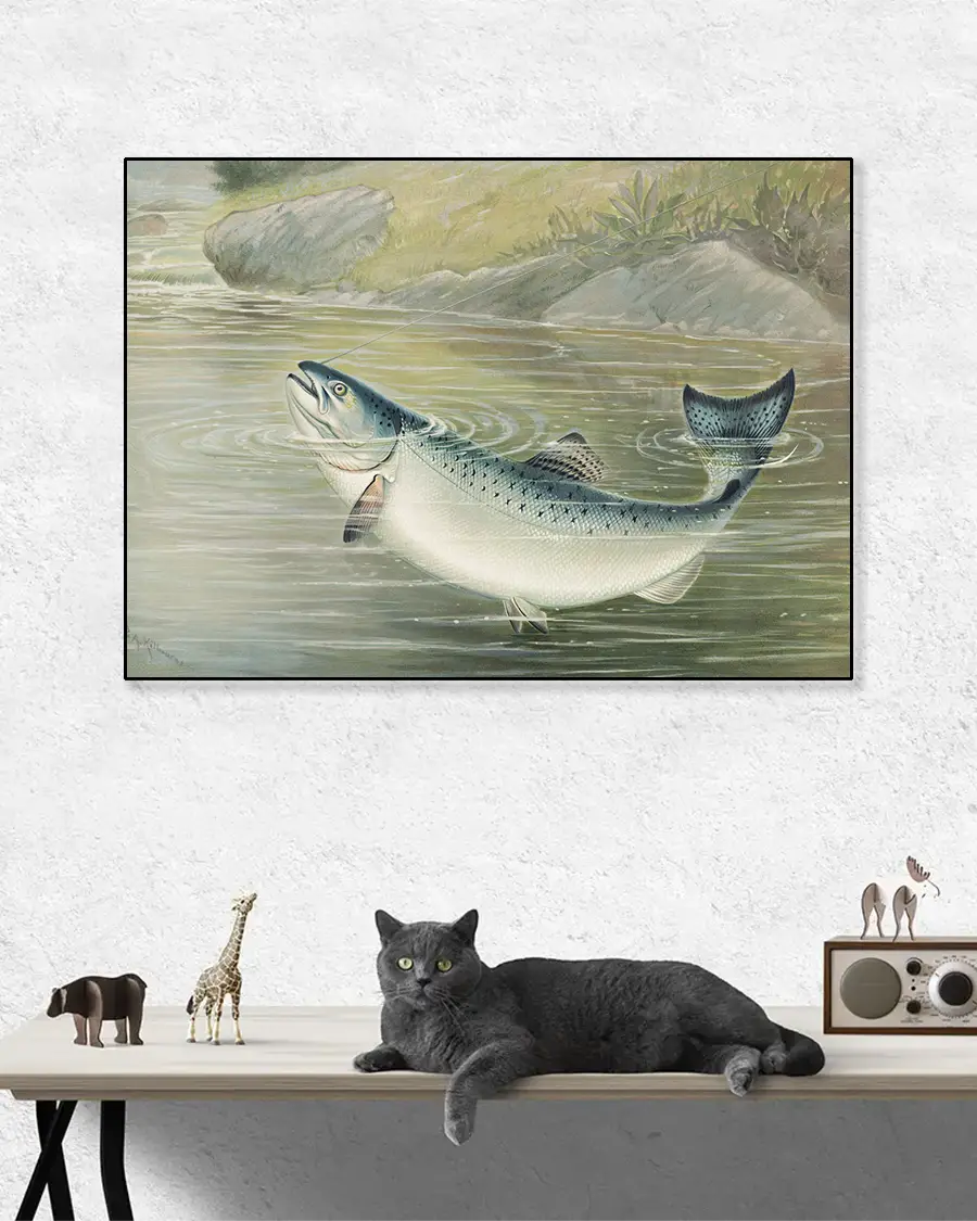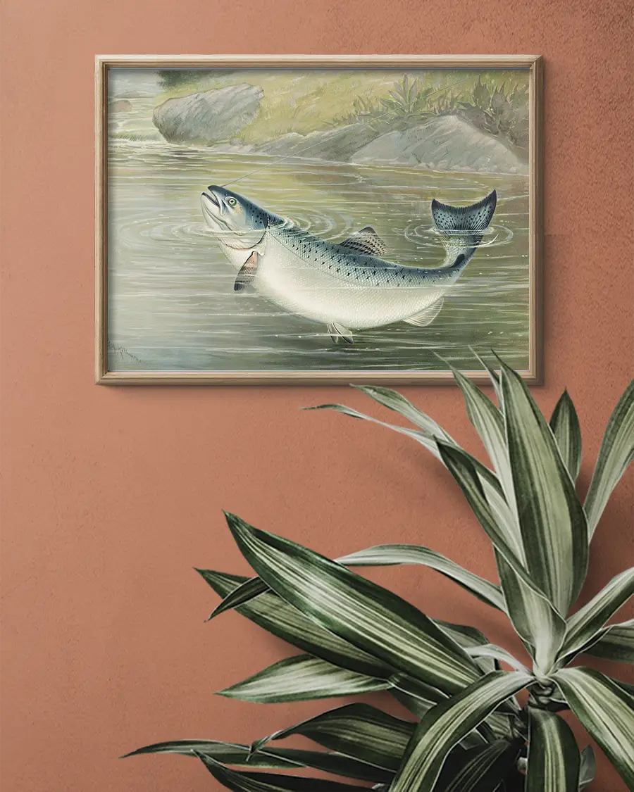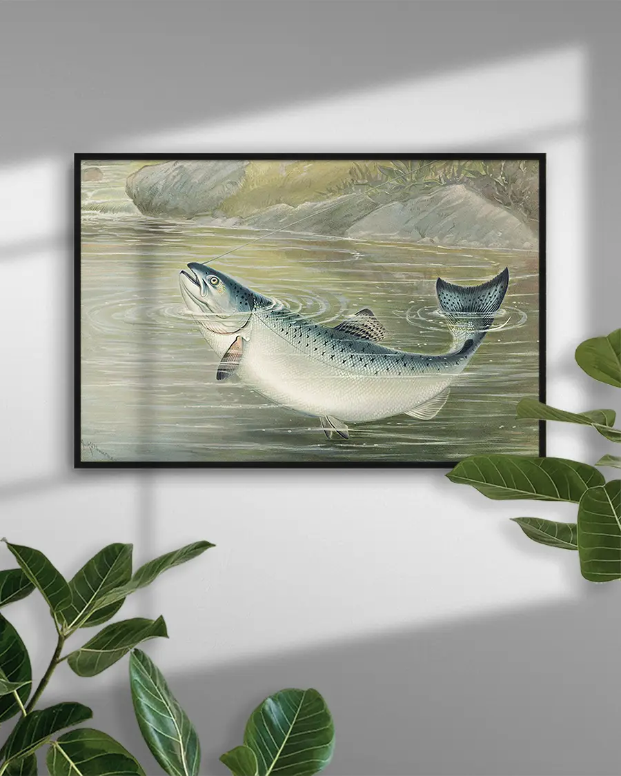 Denna poster är mer än bara en bild – den är en hyllning till naturens kraft, till fiskekulturen och till det klassiska illustrativa hantverket från 1800-talet. Perfekt för dig som uppskattar vintageillustrationer, sportfiske eller vill addera en sofistikerad och historisk känsla till ditt hem, sommarstuga eller kontor.