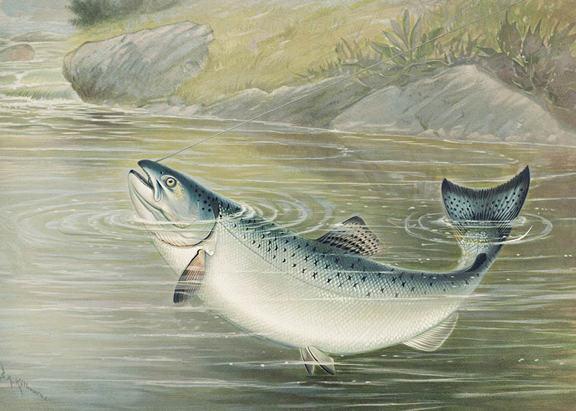 Den klassiska illustrationen The California Salmon (ca. 1879) av Samuel A. Kilbourne fångar ett dramatiskt ögonblick där en lax bryter vattenytan i kamp med en flugfiskares krok. Med imponerande detaljrikedom och mjuka färgtoner skildras både rörelse och stillhet i perfekt balans.
