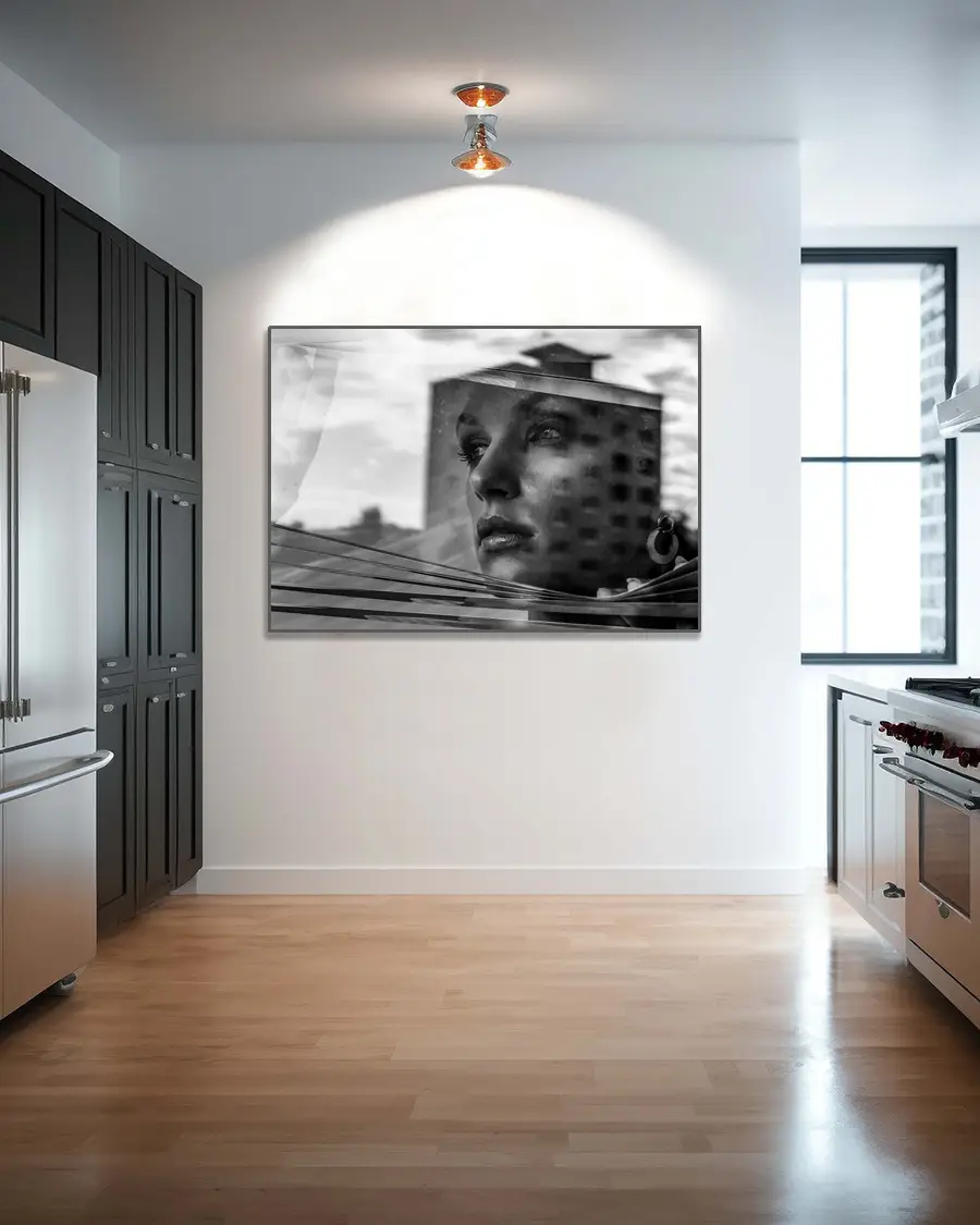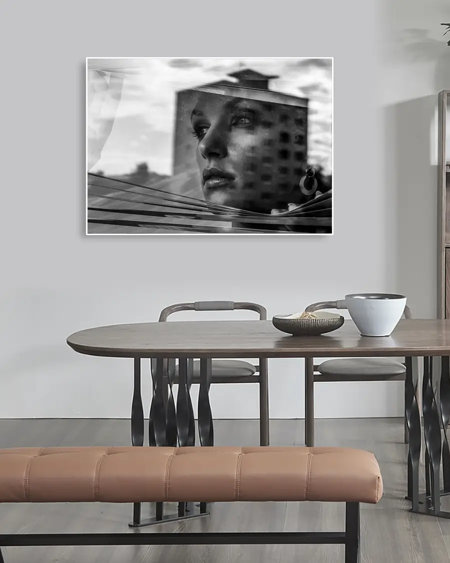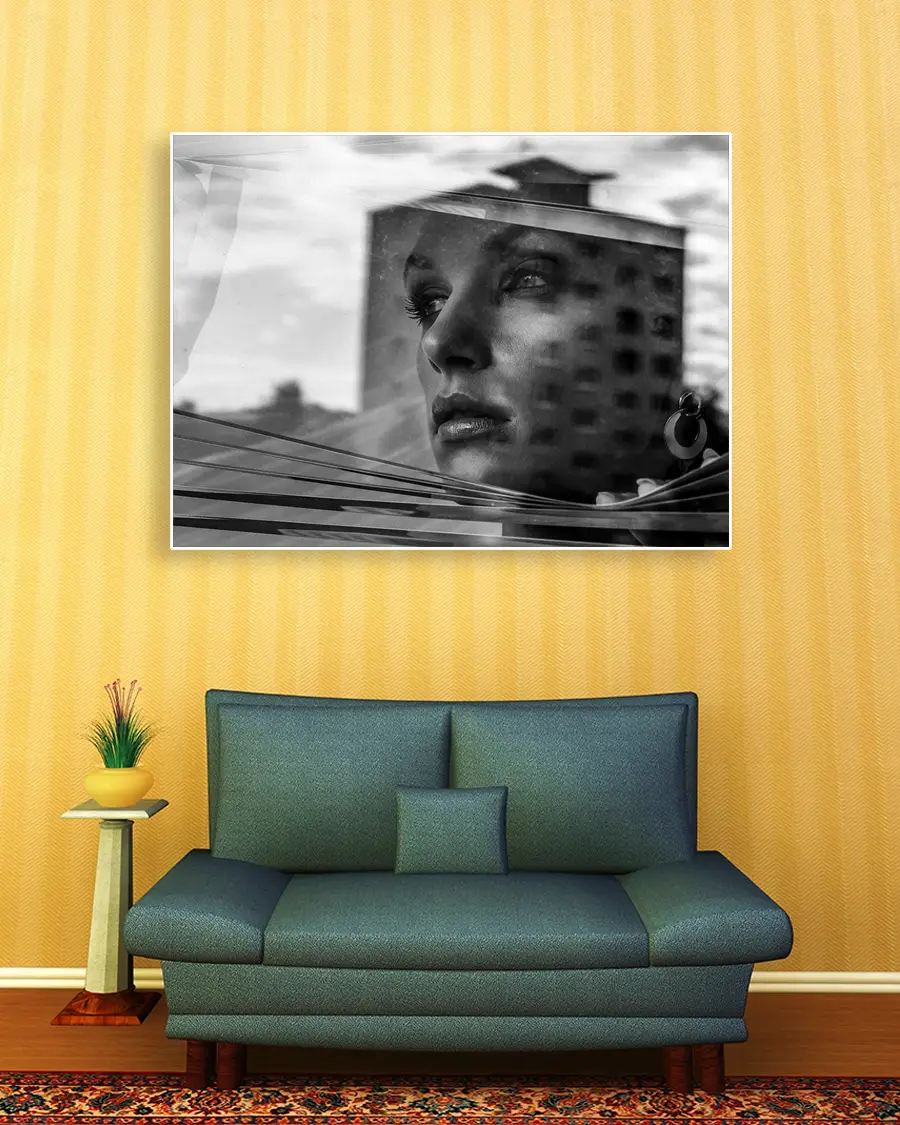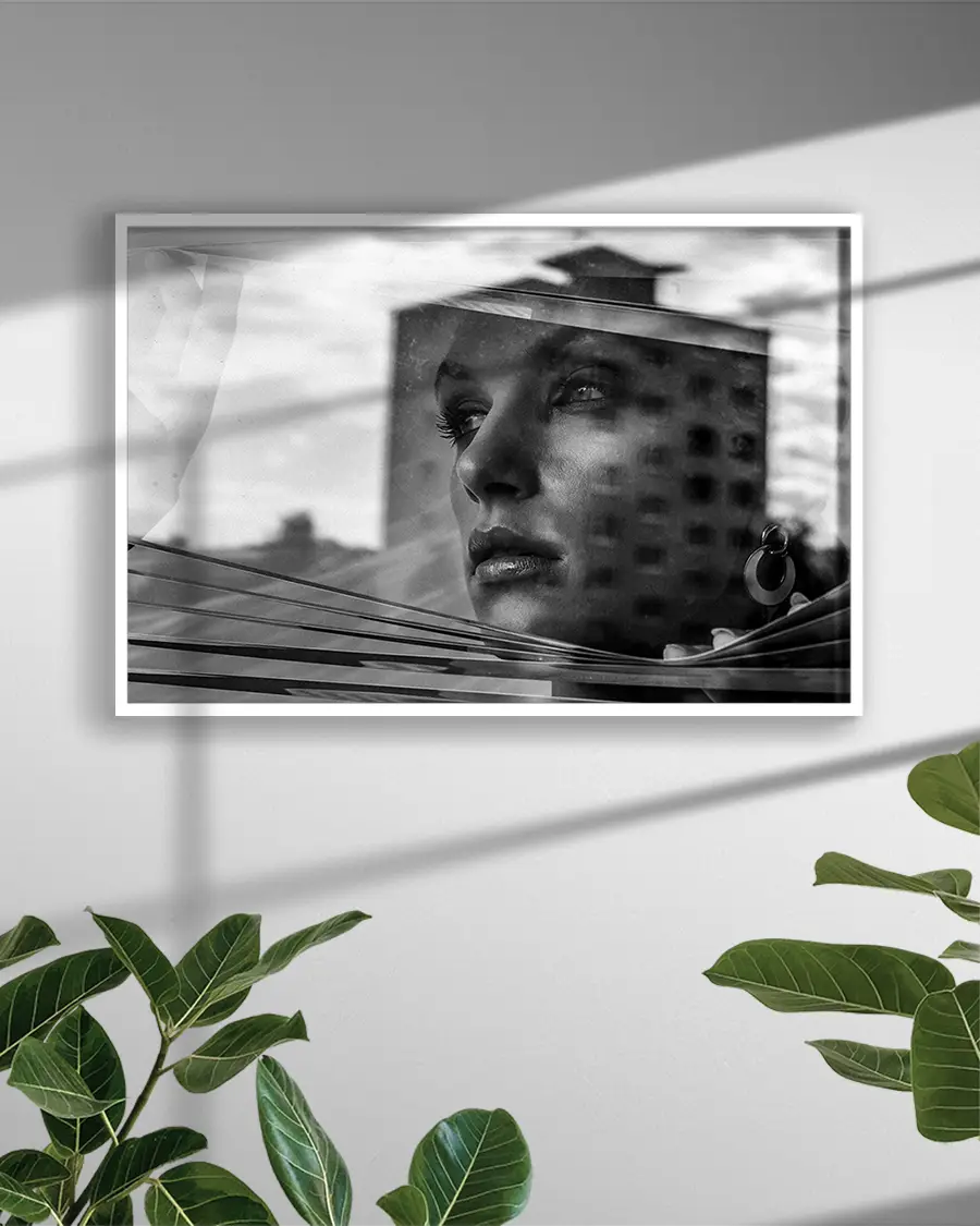 Hennes ansikte speglas i glaset och smälter samman med det urbana landskapet utanför, vilket skapar en känsla av stilla eftertanke och inre dialog. Ljuset, skuggorna och regndropparna samspelar för att förstärka bildens melankoliska och poetiska ton.